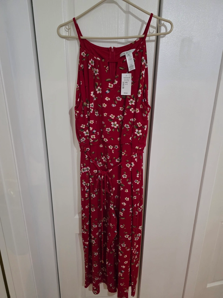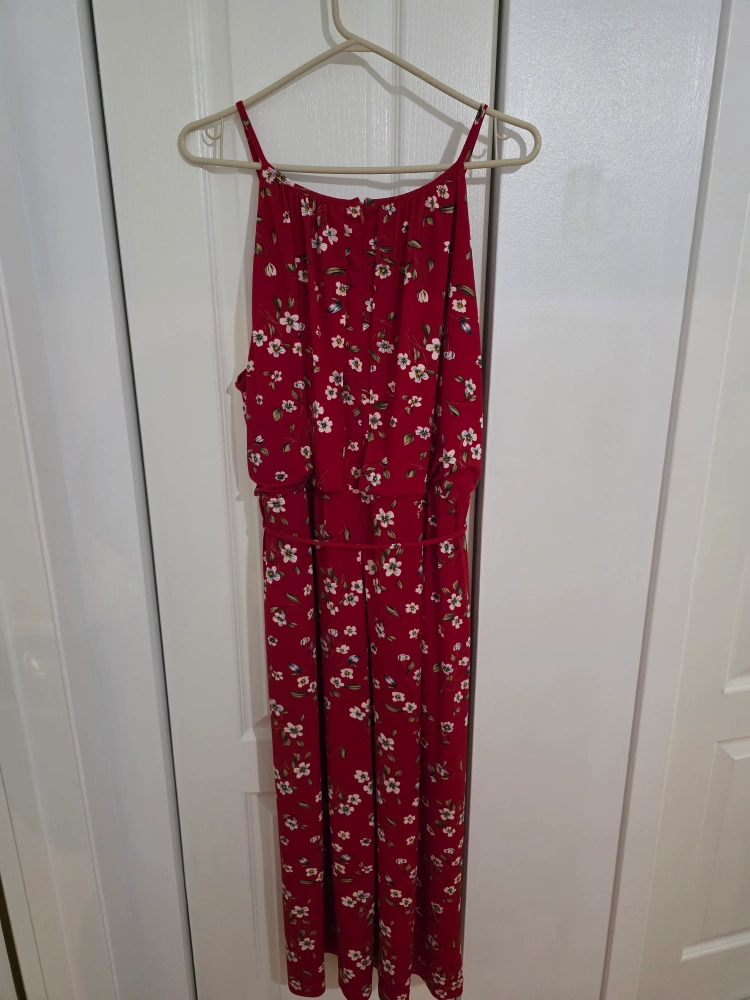 301A beautiful red jumpsuit. Featuring a floral print. A zipper closure in the back. This full length jumpsuit would look amazing on a warm summer day.