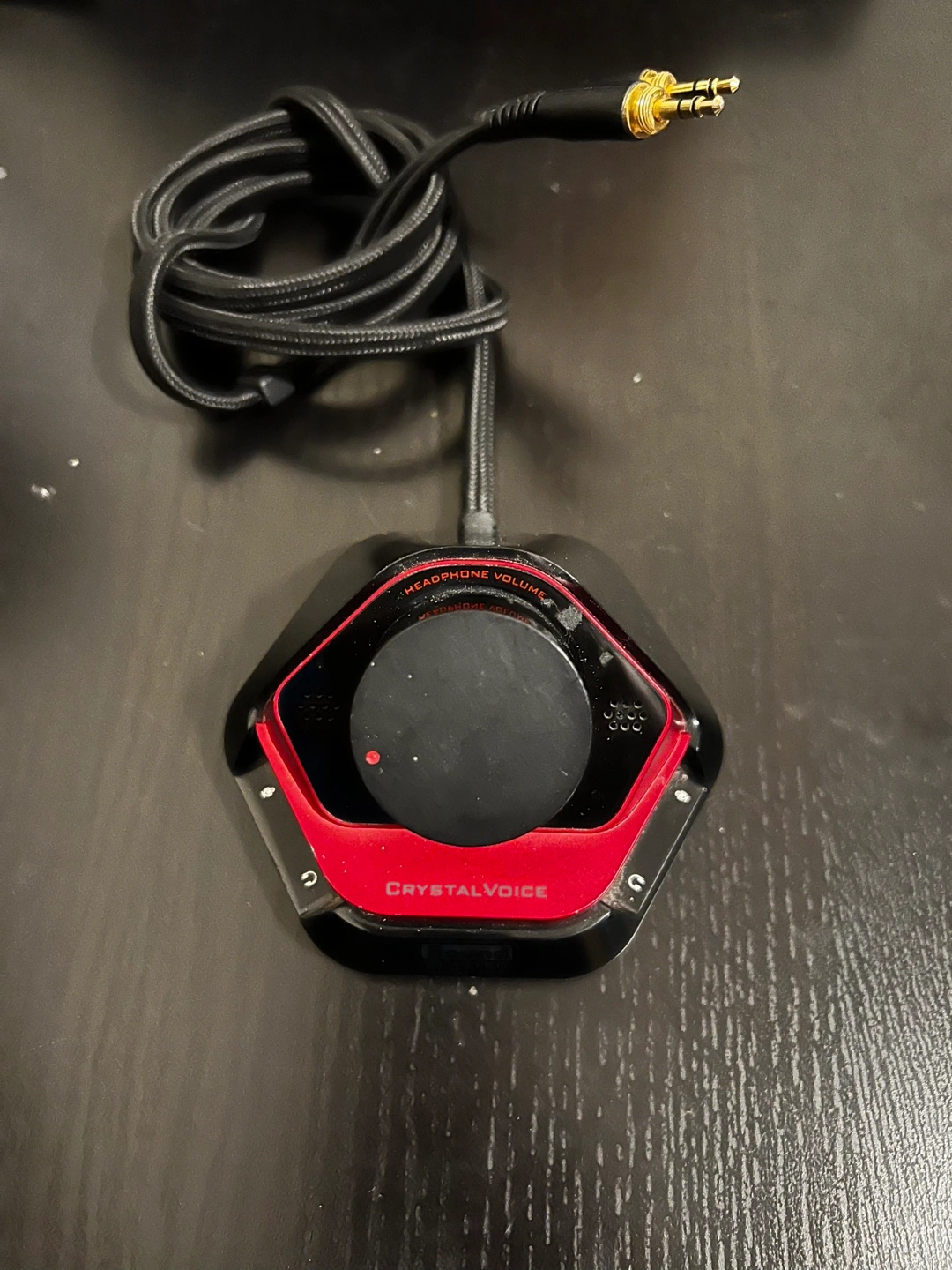 Headphone volume controller. Features a dial, with red and black accents. Has a long, black, braided cord. Could enhance your overall audio experience.