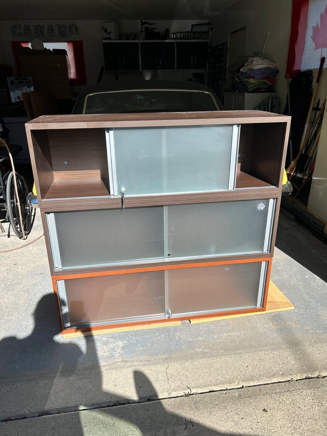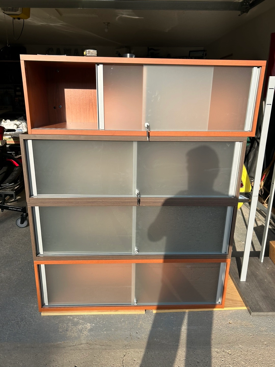 Sliding upper cabinet with frosted sliding doors.