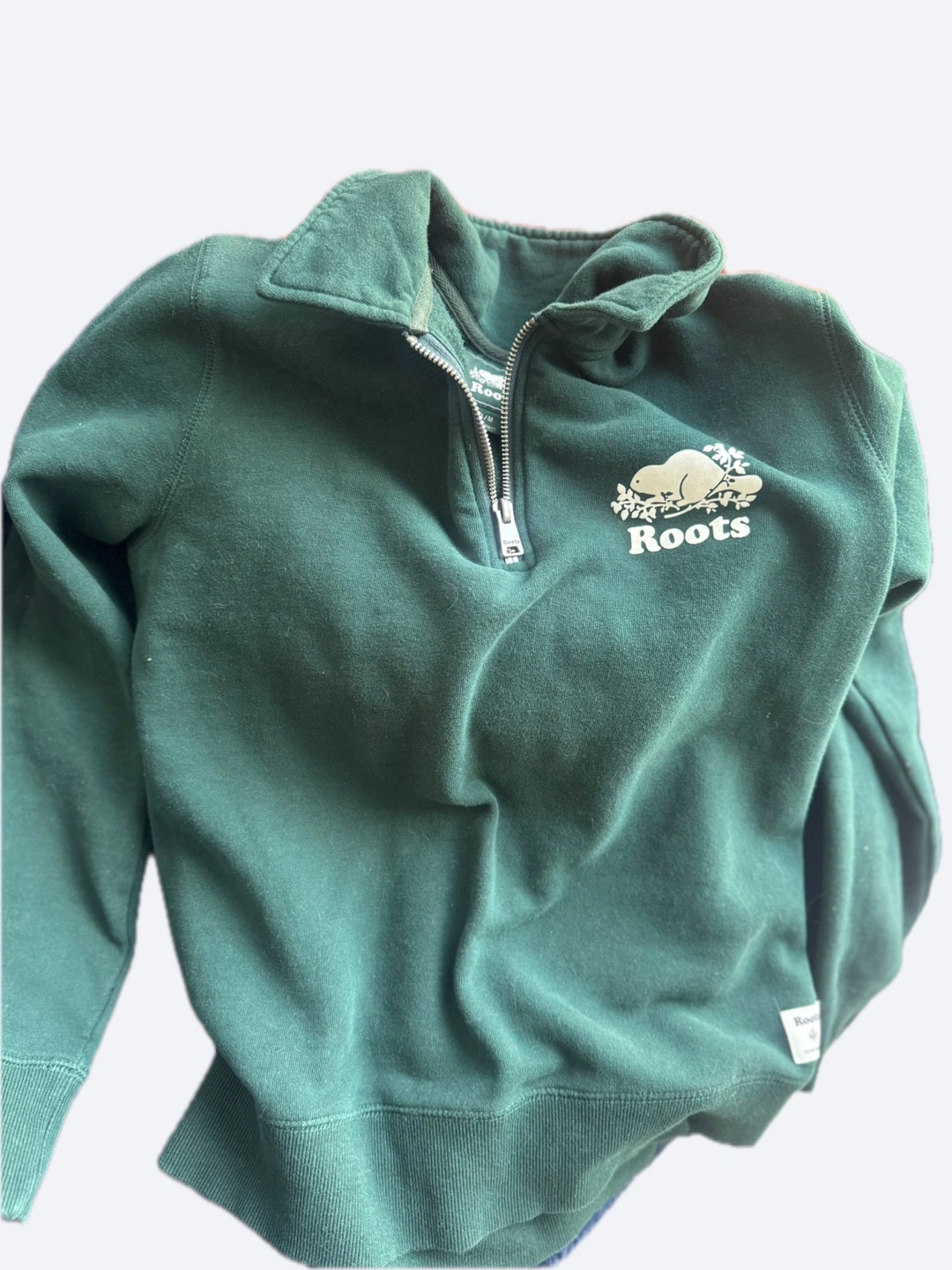 A green sweatshirt with a half-zip closure. Features long sleeves and a ribbed hem. Ideal for those cozy evenings.