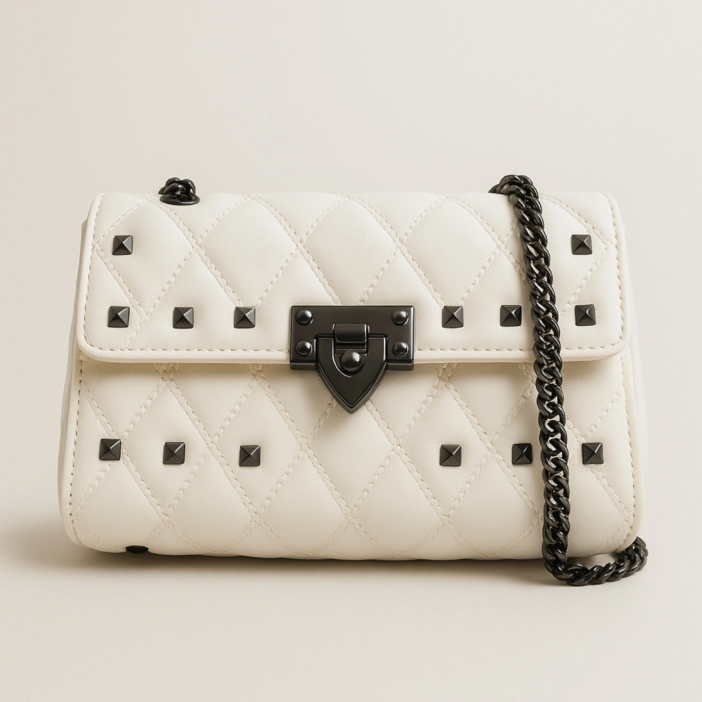 166Crossbody bag in a soft ivory colour. Features a quilted design and dark grey hardware. Has a chain strap. This bag would be perfect to wear while enjoying a nice walk in the park.