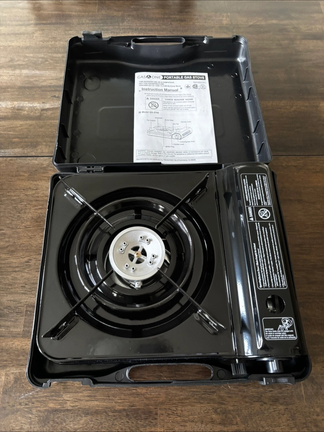 Brand new in box, never used. Comes in a durable black case. Easy to carry. Great for cooking a comforting meal on your next camping trip.