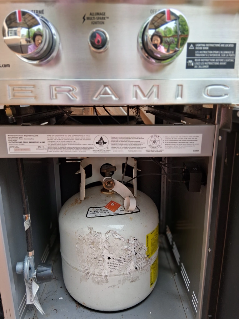 A beautiful ceramic grill for your cooking pleasure. Stainless steel finish. Features two knobs, and a temperature gauge. A wonderful way to prepare your food on a relaxing summer evening.