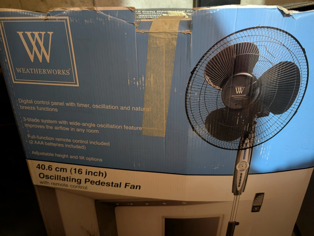 A Weatherworks oscillating pedestal fan. Features a digital control panel. Offers a 3-blade system. Includes remote control. Adjusts for height and tilt. This fan can help bring you relief on a hot day.
