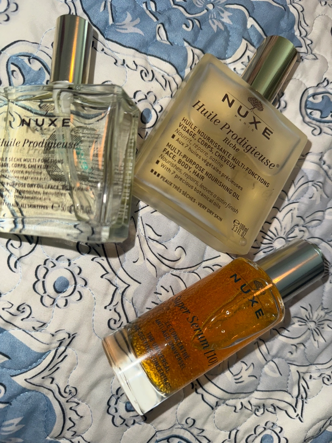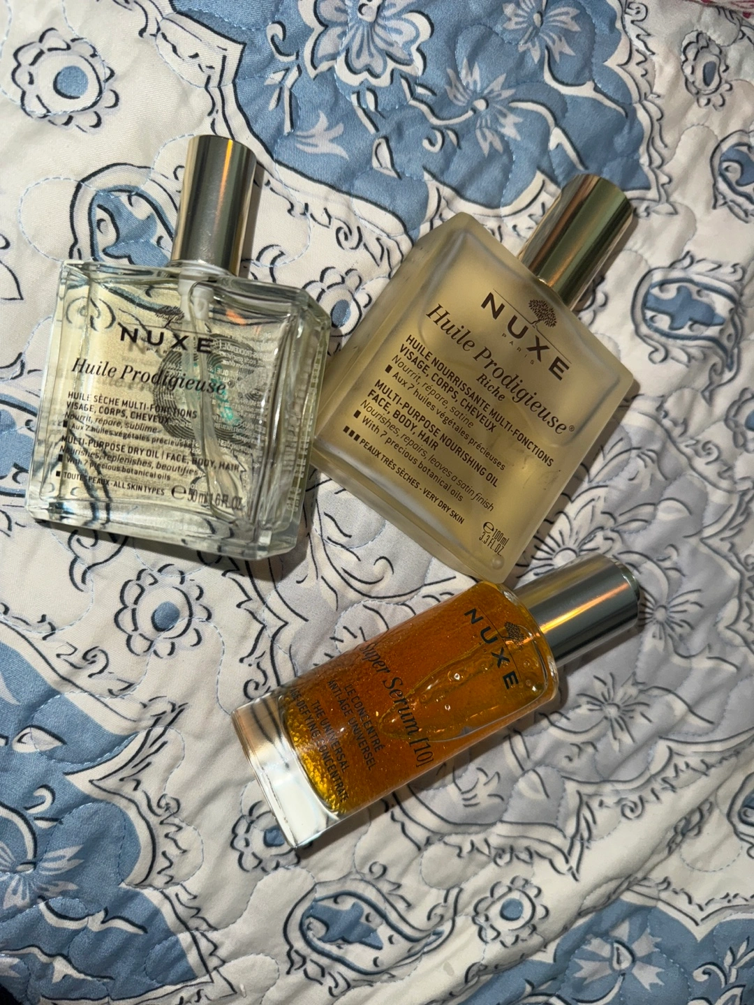 A collection of Nuxe face and body oils. Features three bottles. With regular use, you will surely find yourself feeling relaxed and rejuvenated.