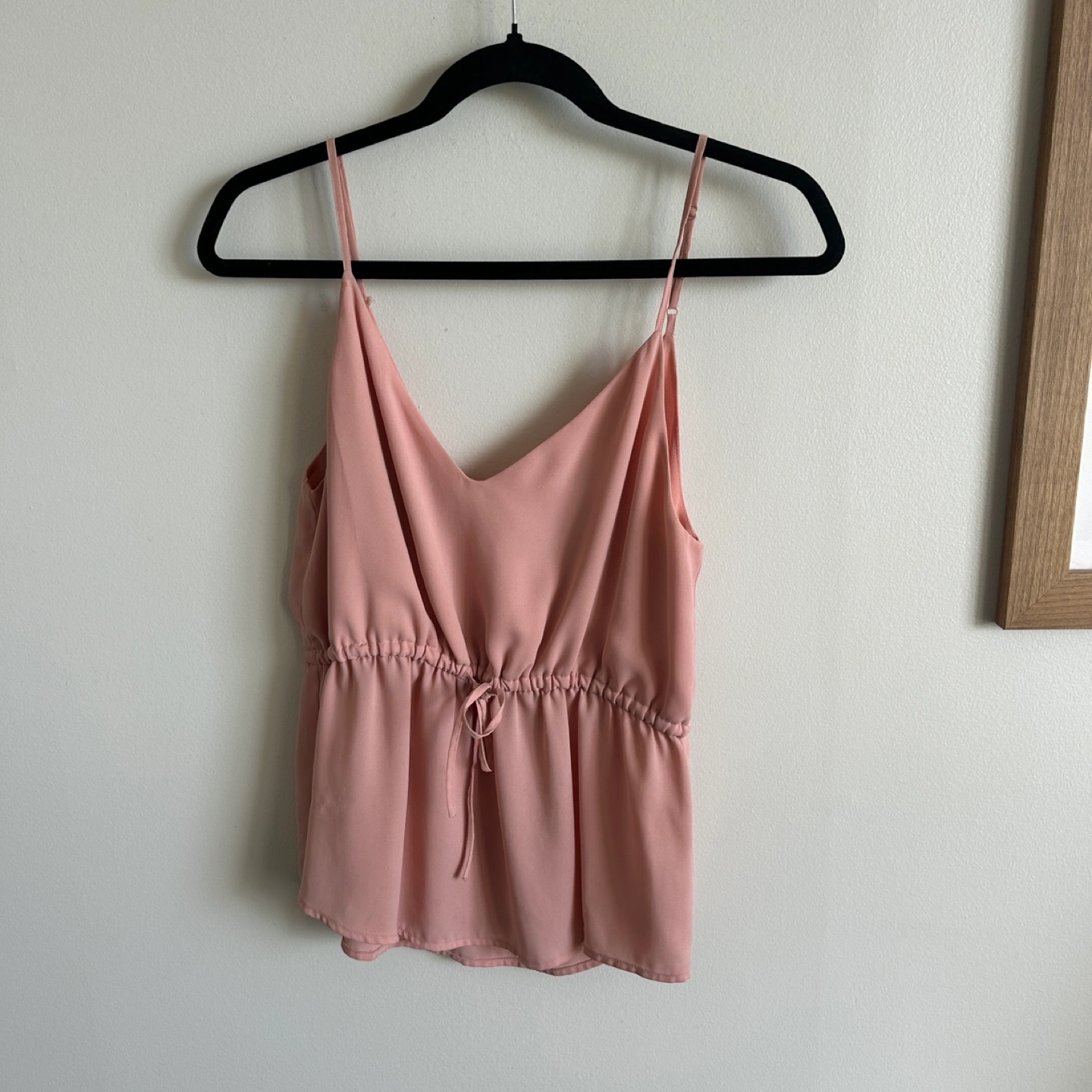 A flowy tank top in a beautiful pink colour. It features adjustable straps and a front tie. A great choice for a relaxing brunch or day out.