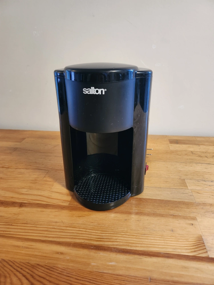 A small, black coffee maker. It features a power switch. Perfect for brewing a single cup of coffee for a peaceful morning.