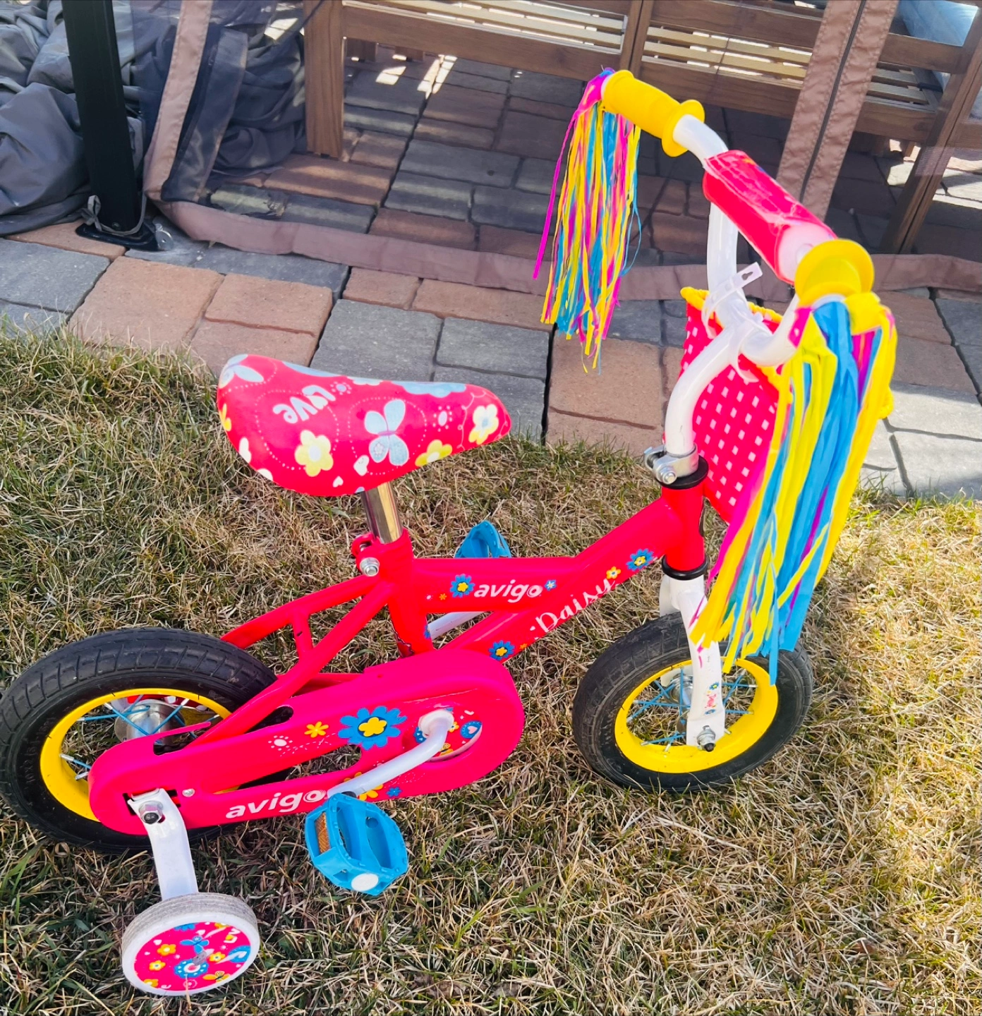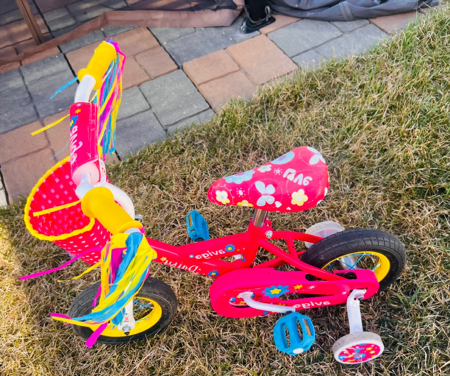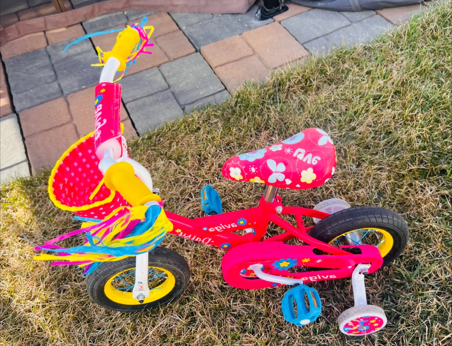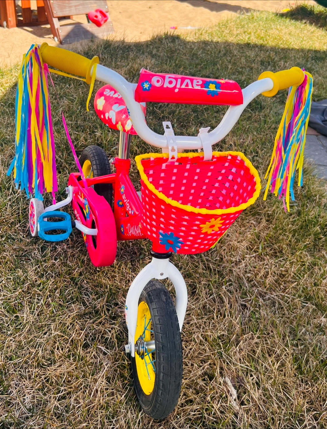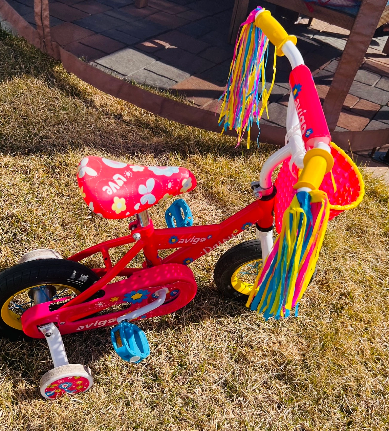 A vibrant red bicycle with a flower design. Featuring training wheels. Including a basket and decorative streamers. A perfect item to get some fresh air.
