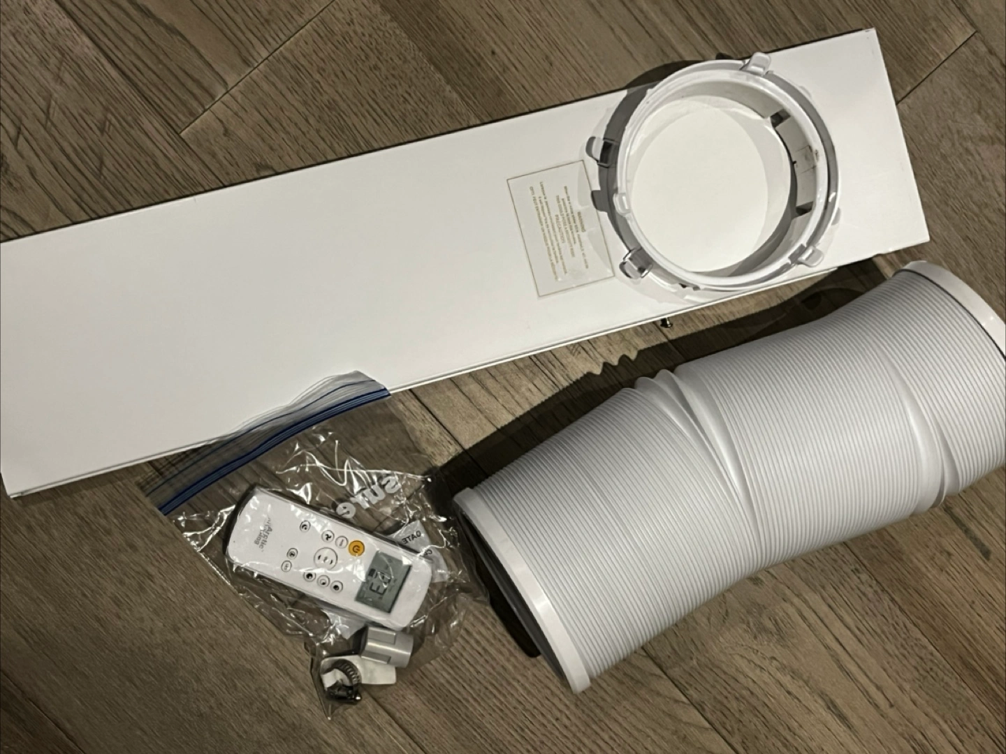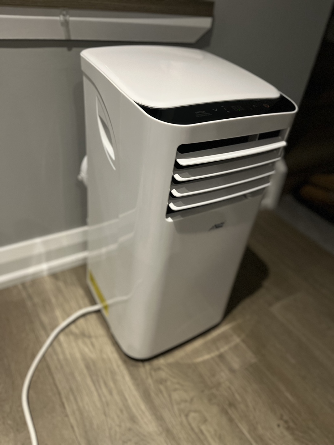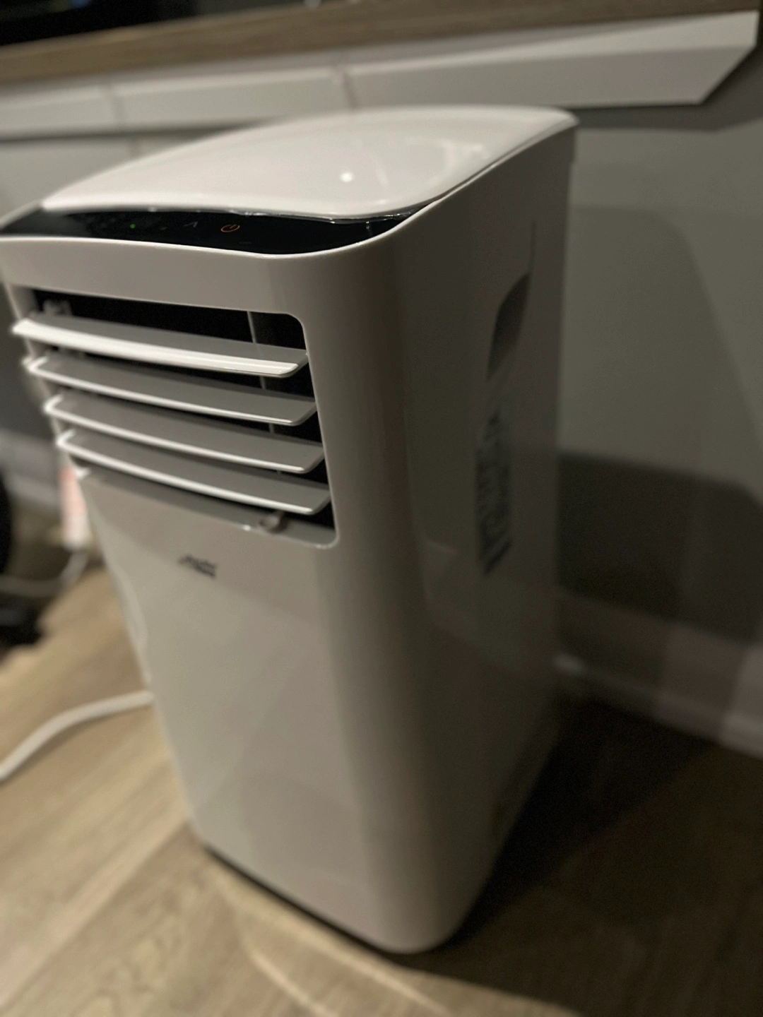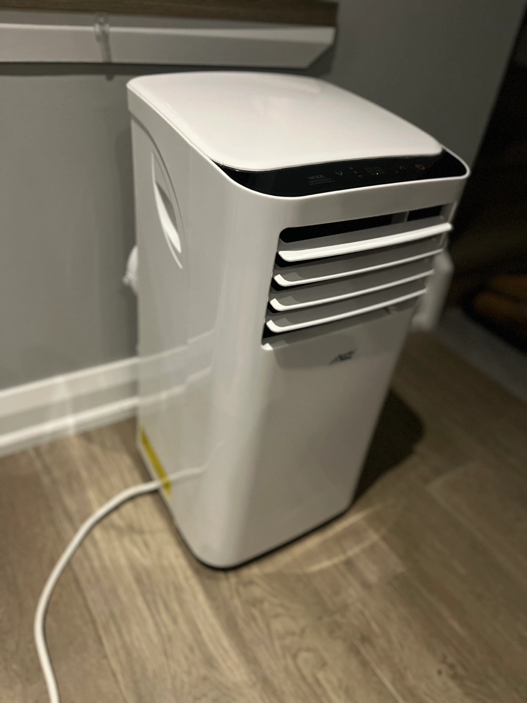 A portable air conditioner, white in colour. Includes the remote control and window attachments. This will make your space a comfortable place to relax in.