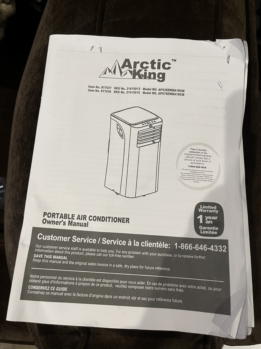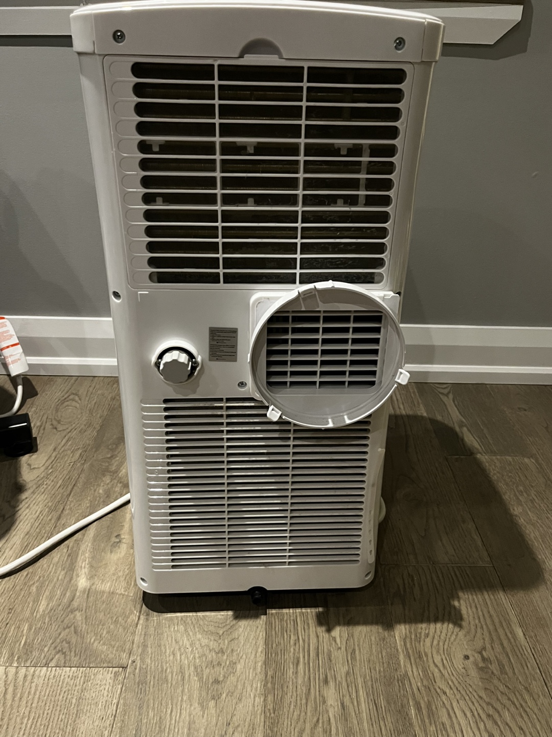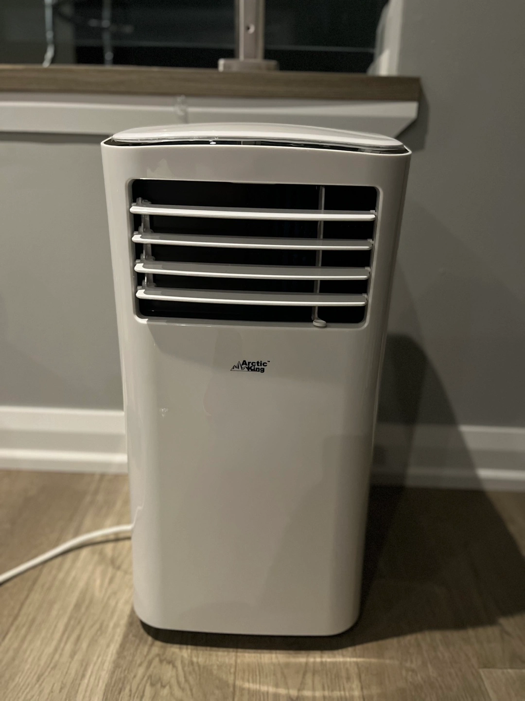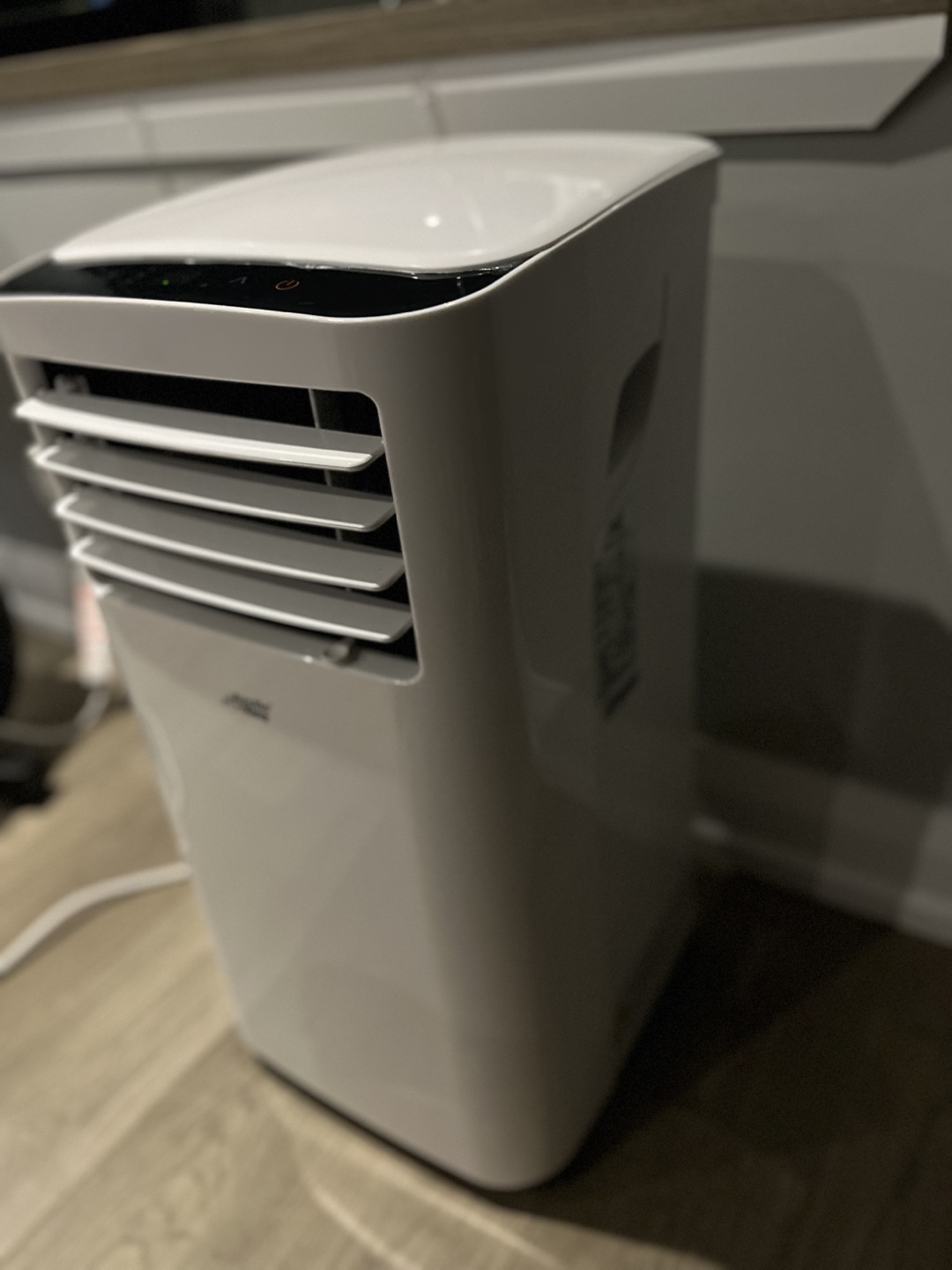 A portable air conditioner, white in colour. Includes the remote control and window attachments. This will make your space a comfortable place to relax in.