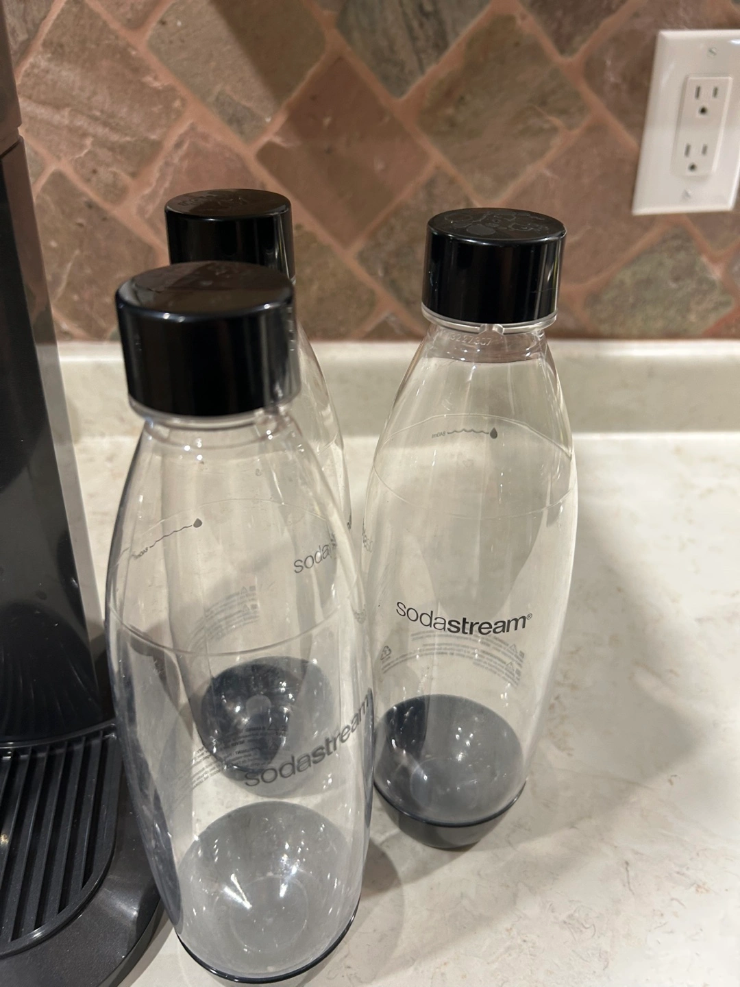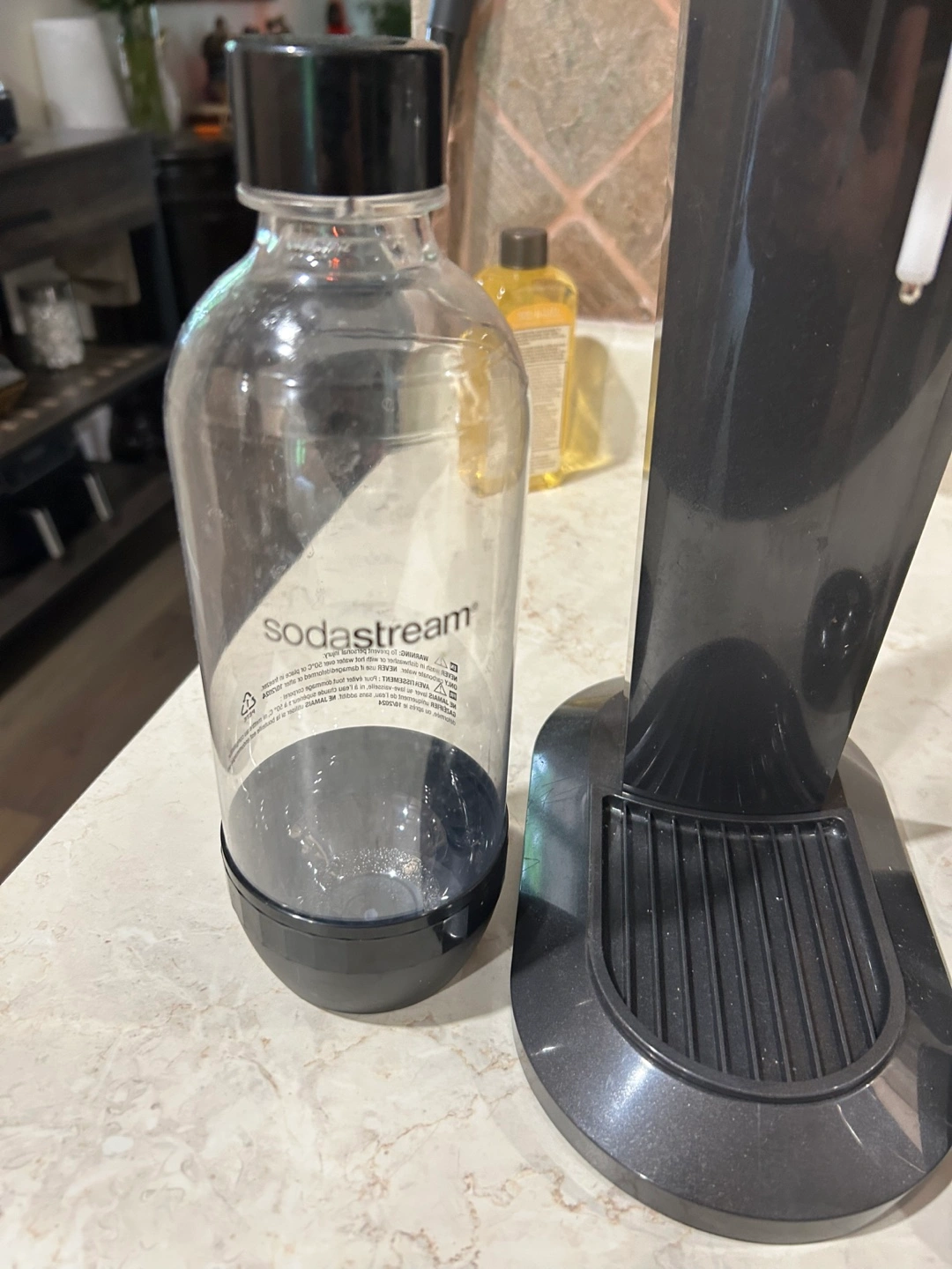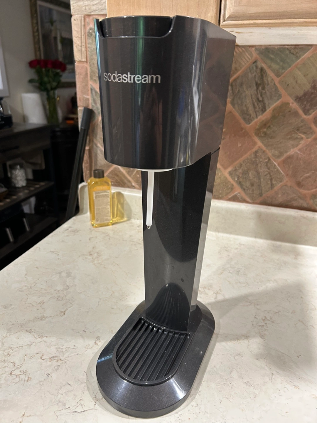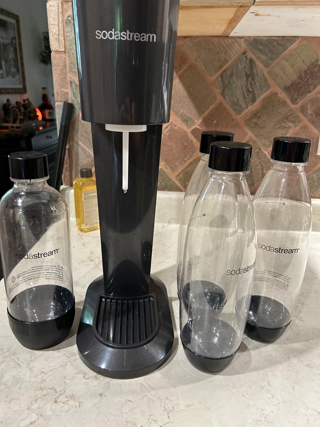 Dark grey SodaStream sparkling water maker. Includes 4 soda stream bottles hardly used. In the excellent condition.