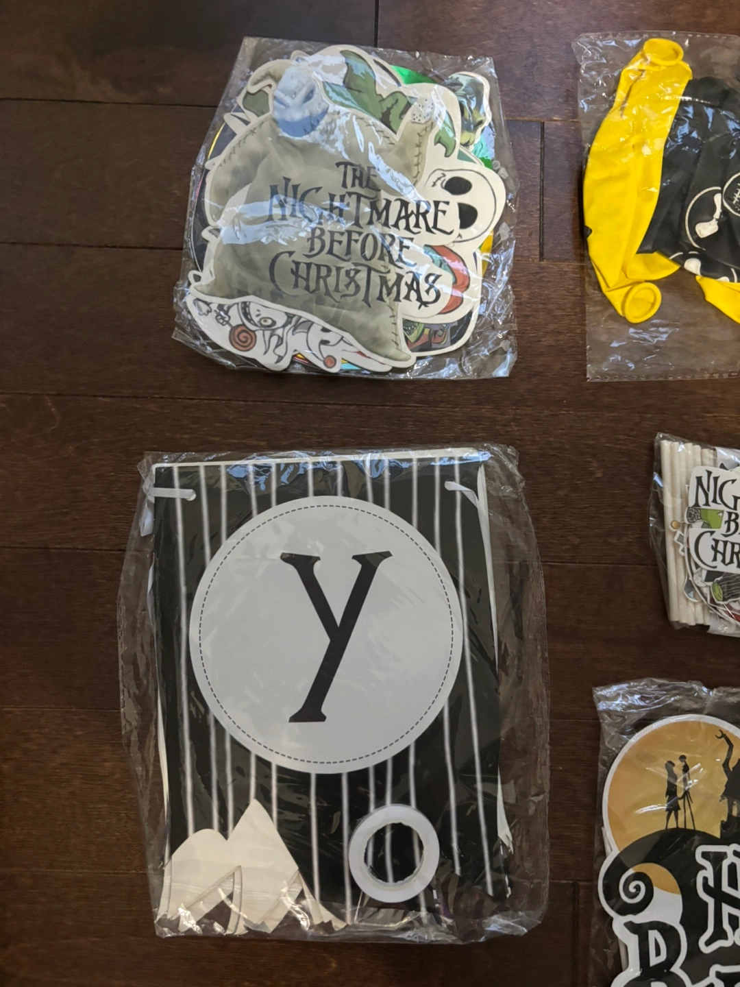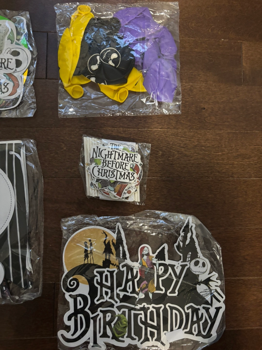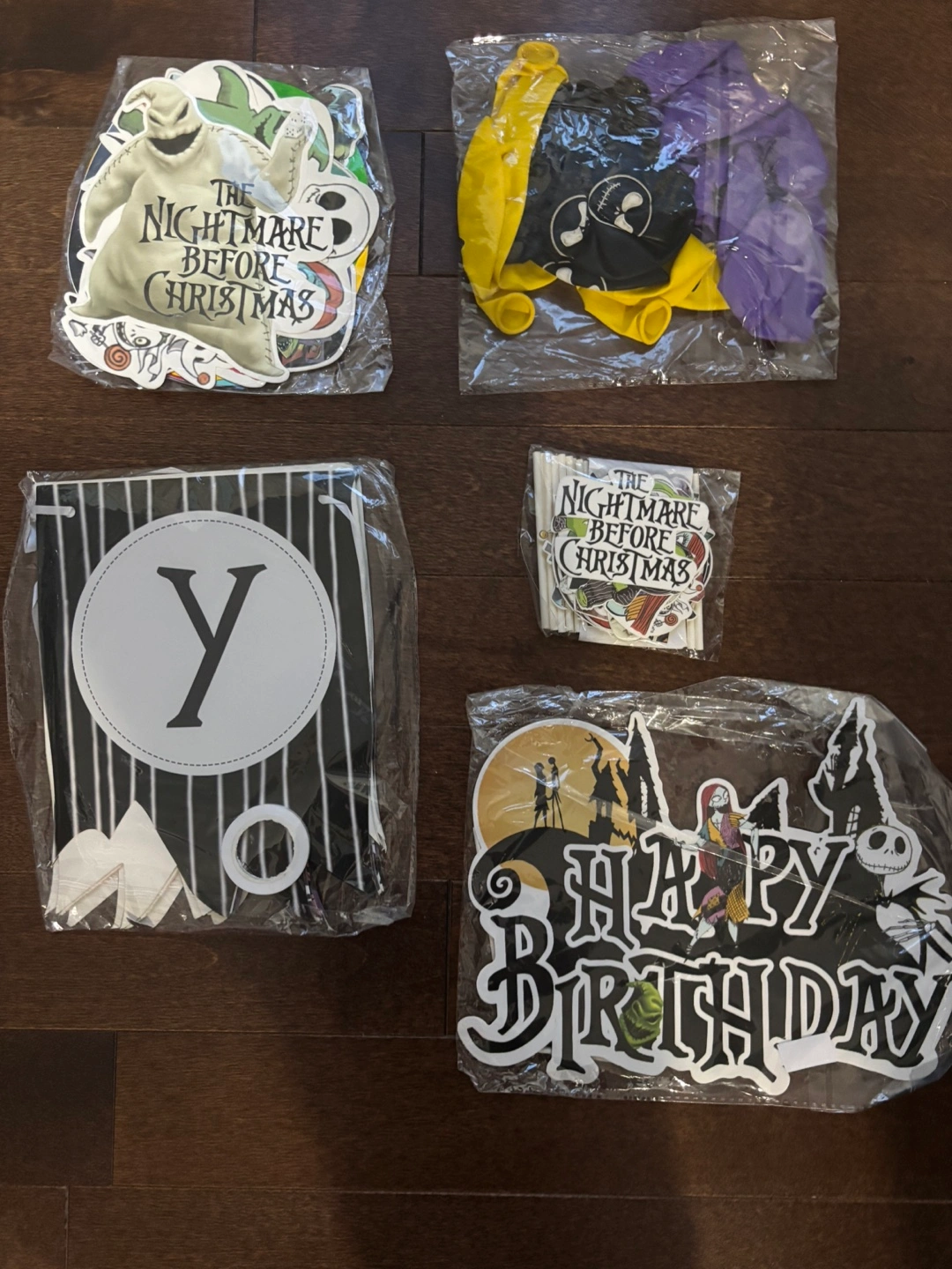 A collection of party decorations. Includes balloons, cake toppers, and a banner. They are perfect for a spooky, fun birthday celebration.