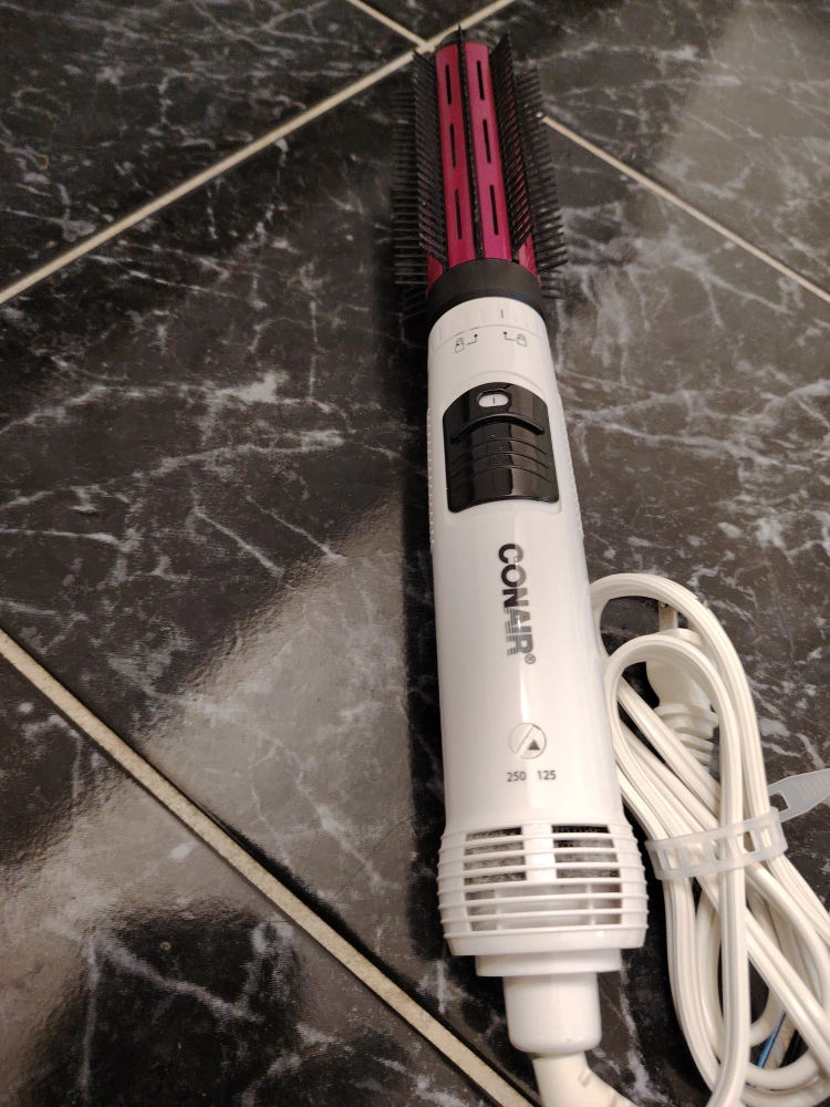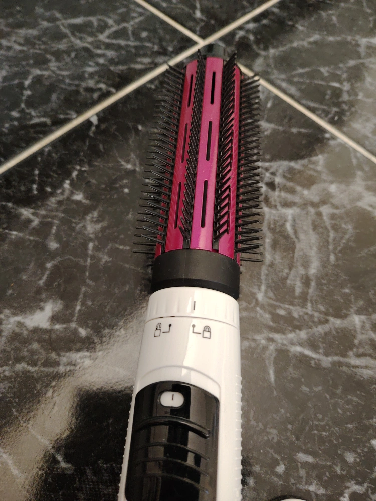 A hot air styling brush in white, black, and pink. Contains multiple settings and a swivel cord. The brush head is cylindrical. This item will help you create a perfect hair style and a feeling of calm.