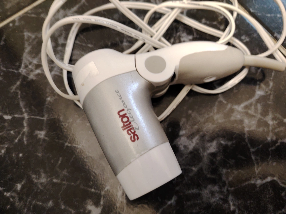 A small hair dryer, white and grey in colour. Features a compact design for travel . The power cord is white. This hair dryer would be perfect for a relaxing self-care evening.