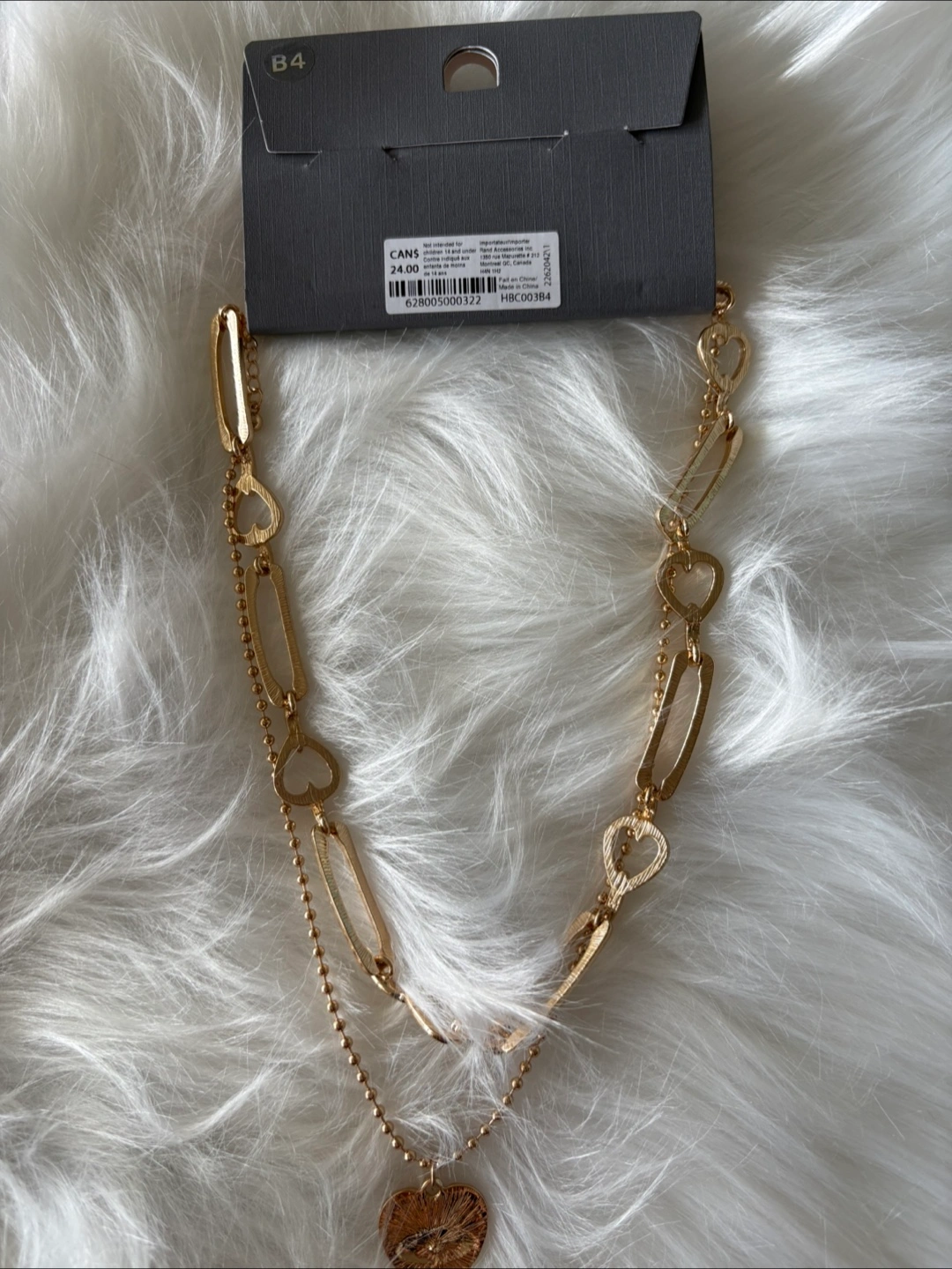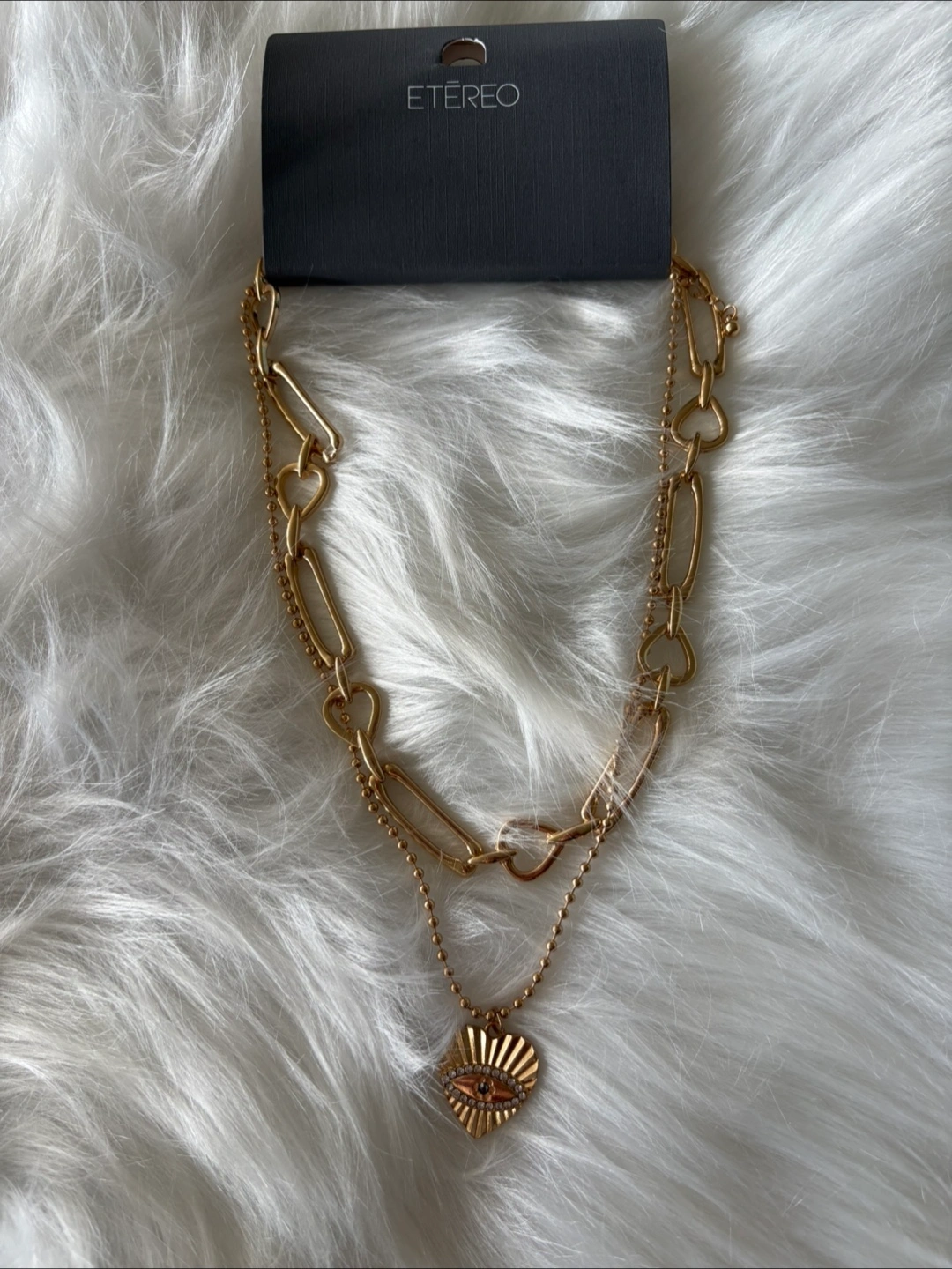 Two-tiered gold necklace. Features a heart pendant with an eye design. Would be lovely to wear with a dress or casual outfit, it's the perfect accessory for any occasion.