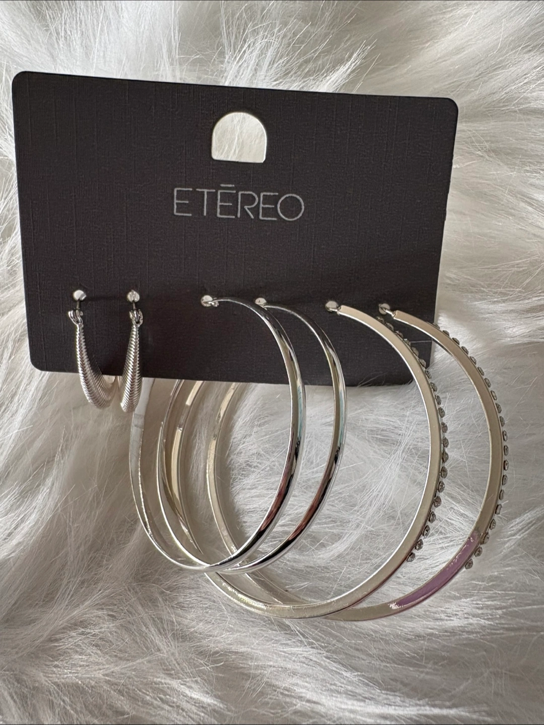 A lovely set of silver earrings, perfect for any occasion. With these earrings, you will be set to relax and enjoy yourself. The set includes multiple sizes and styles of hoops.