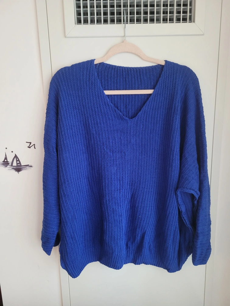 Beautiful blue sweater. Features long sleeves, a V-neck, and a relaxed fit. Cash and pickup only, please.