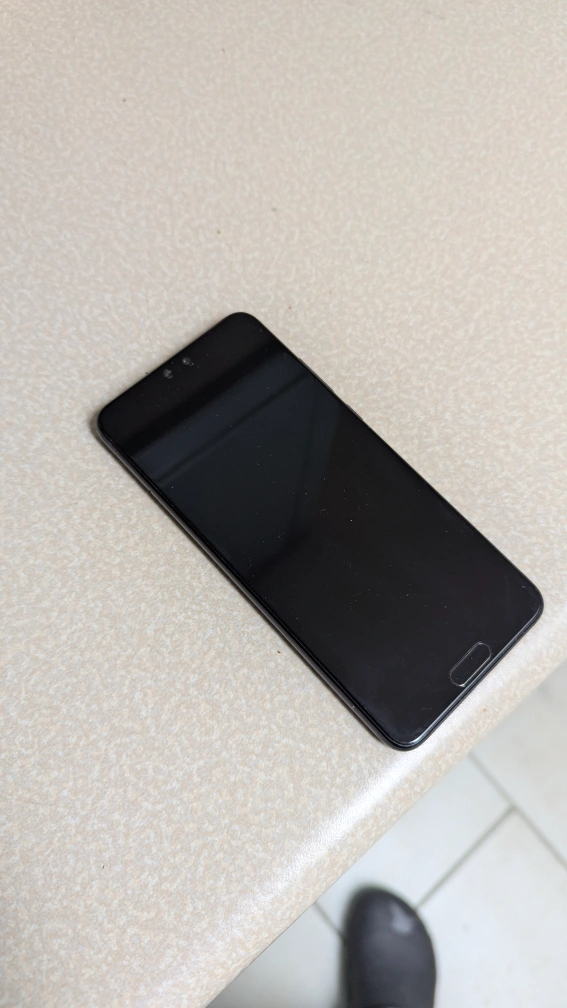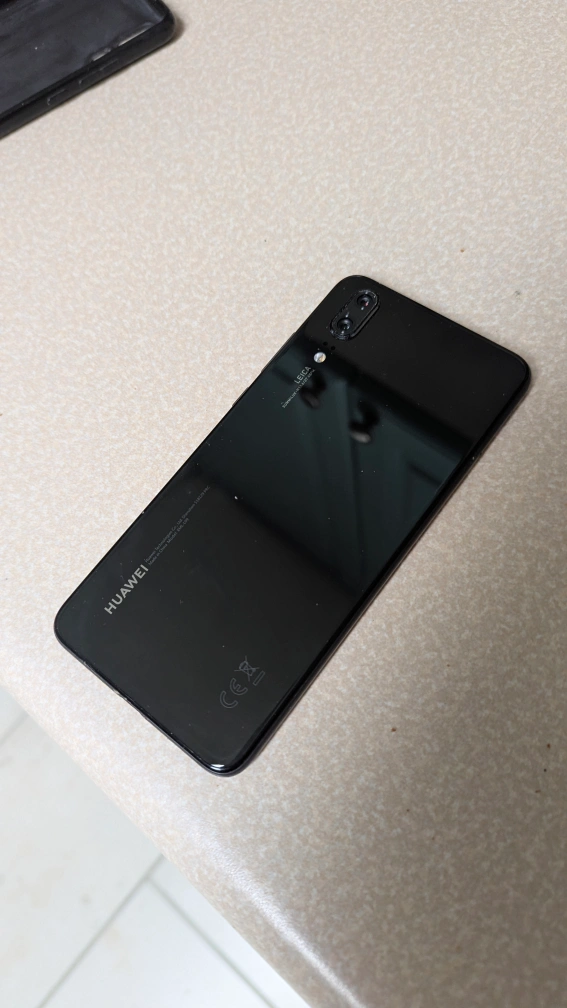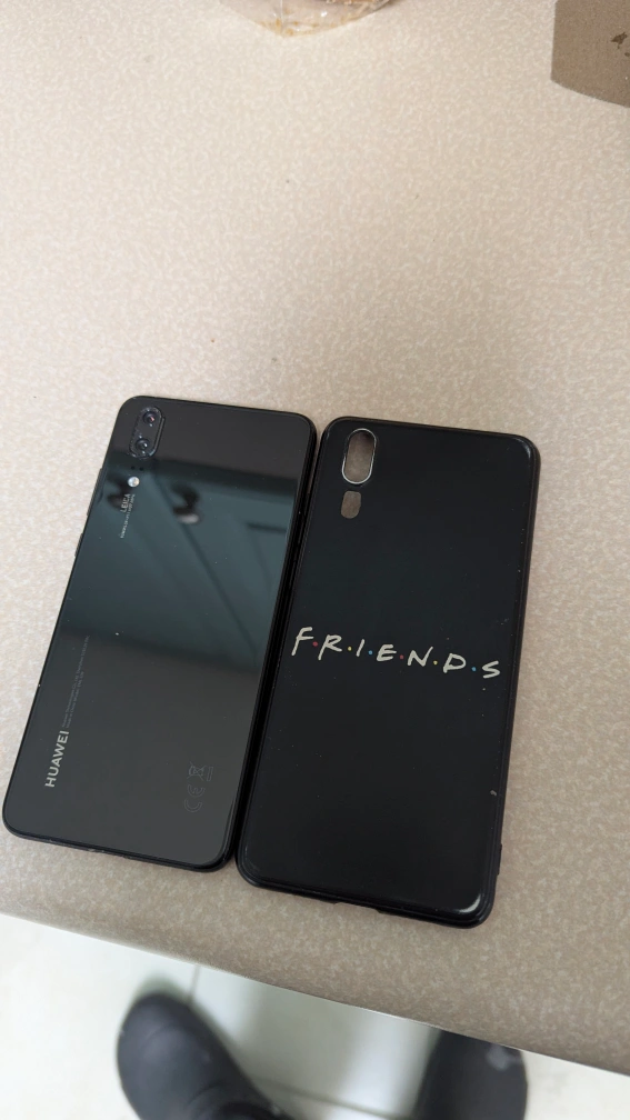 Black Huawei P20 smartphone. Includes a Friends-themed phone case. Sim slot doesn't work, so you can only use it for games.