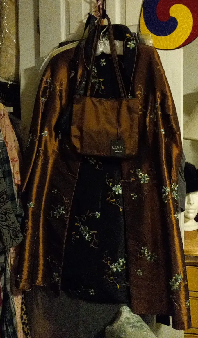 A lovely coat with a matching purse. The coat is a beautiful brown color. It is floral patterned. The matching purse is a similar brown shade. Put it on and go enjoy the day in style.
