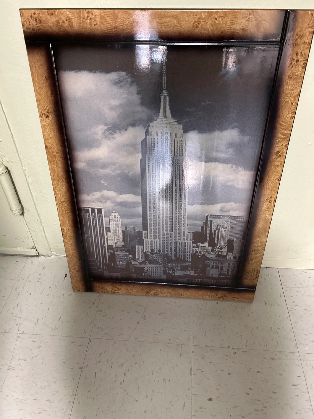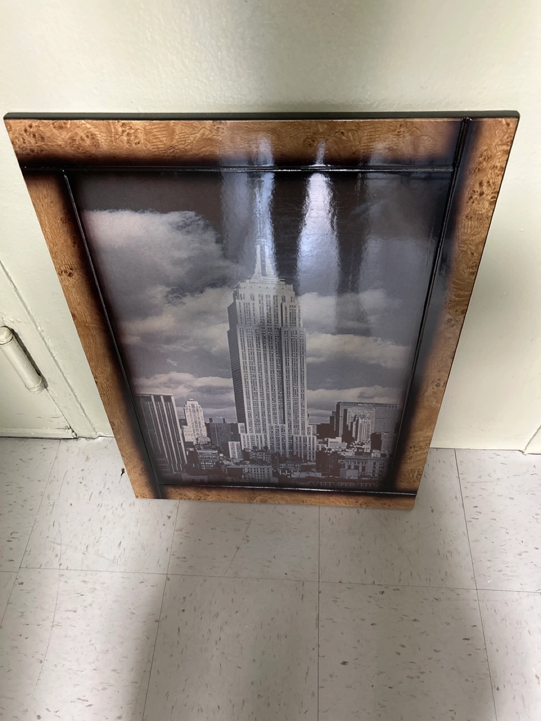 A picture of the Empire State Building. The frame is made of wood, it appears to be black and brown. Adding this picture to your home can instantly bring a feeling of calm to any room.