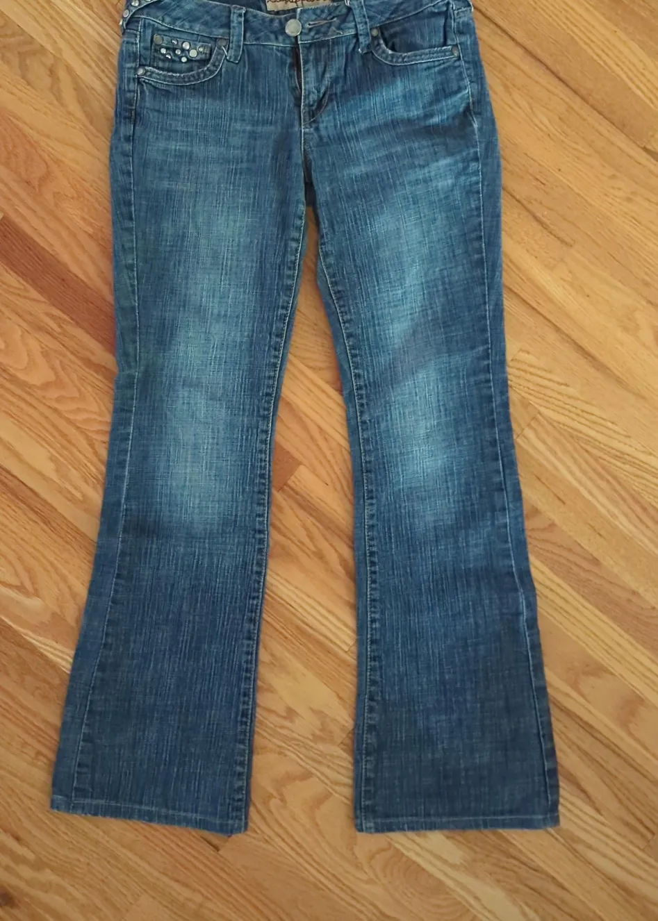 Flare jeans with bejeweled embellishments on the back pockets and front pockets. A relaxing wear for any casual occasion.