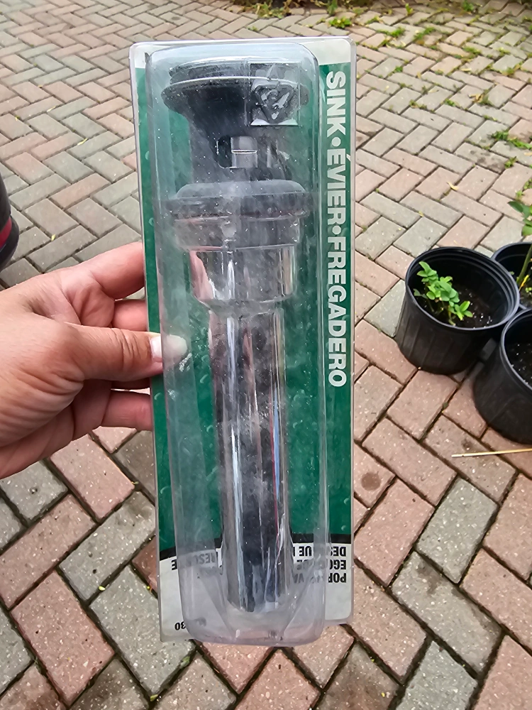 Sink drain assembly, in package. Includes a chrome-finished body. Perfect for any of your kitchen or bathroom sink needs, it can help you to make some changes to your house with a very low cost.
