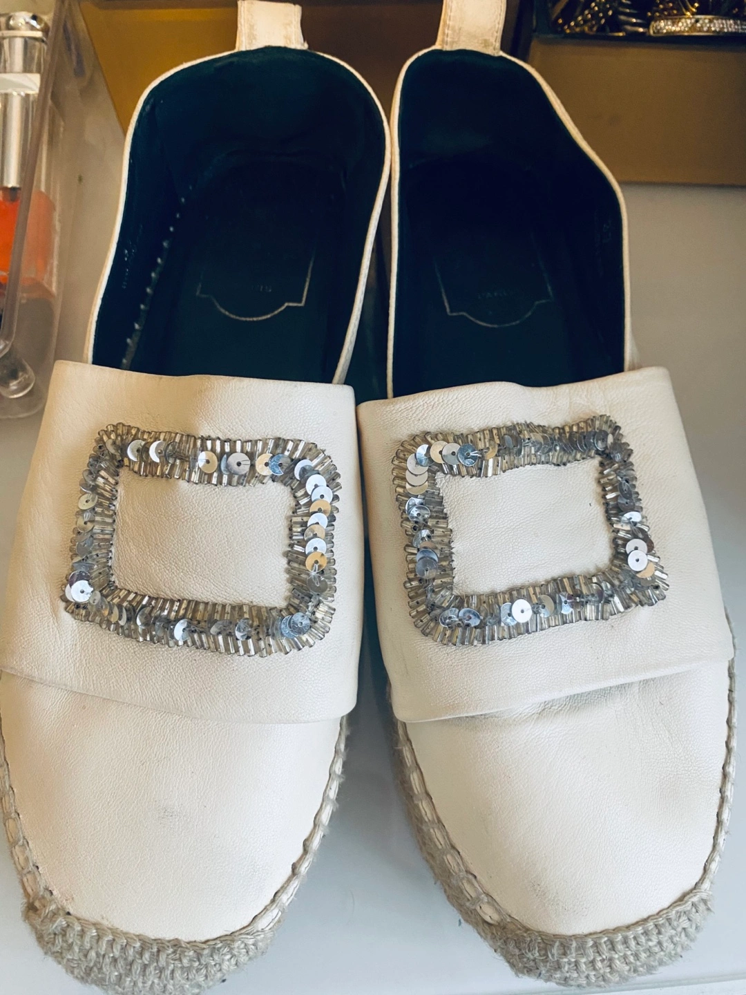 These white espadrilles. They have embellishments. The soles look to have some wear, but are overall in good shape. You will love how these shoes make you feel.