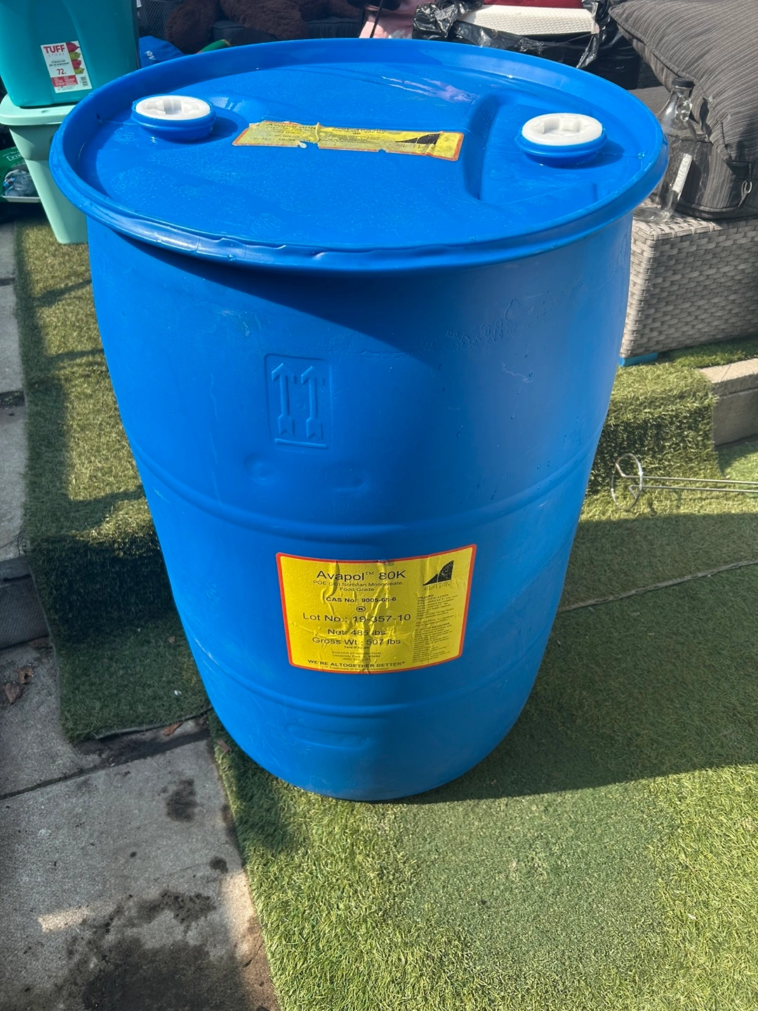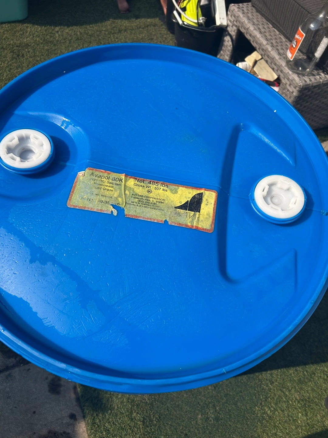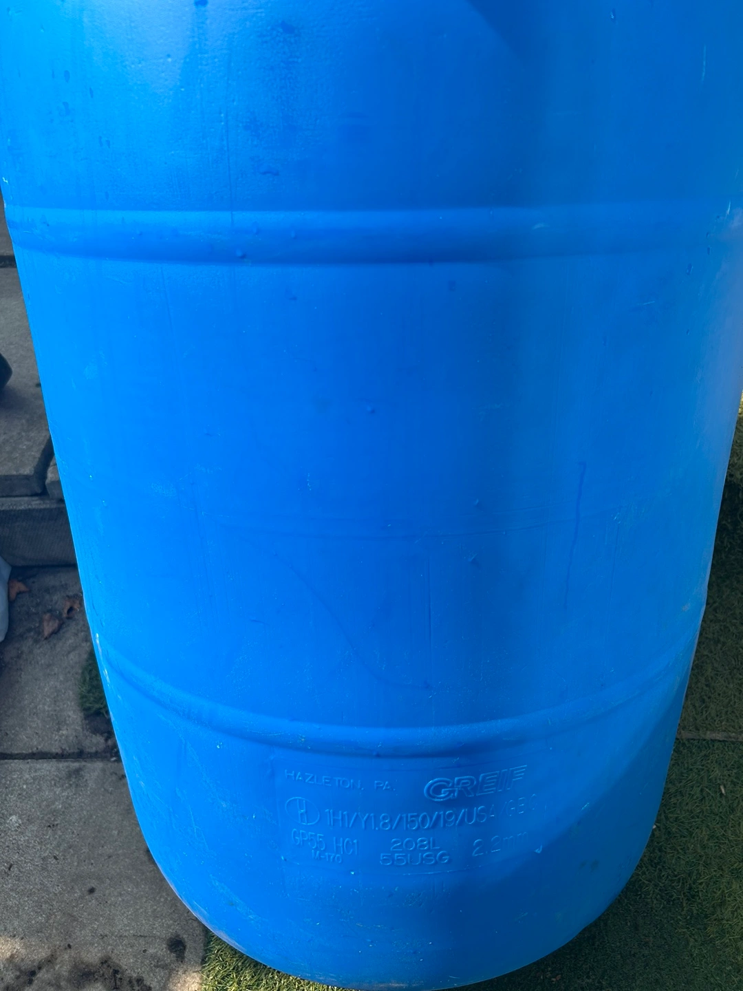 A blue plastic barrel. The lid has two white inserts and a label. Great for outdoor storage needs.