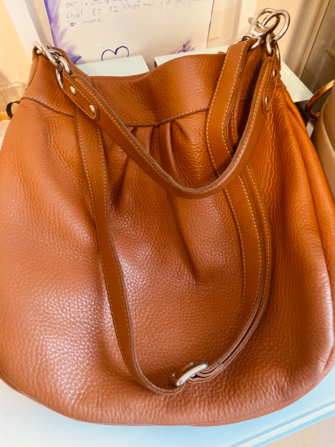 A stylish leather handbag. A great everyday bag, perfect for all your necessities. The bag is a rich brown colour, with a zipper closure and a single pocket inside. This bag is perfect for a relaxing stroll.