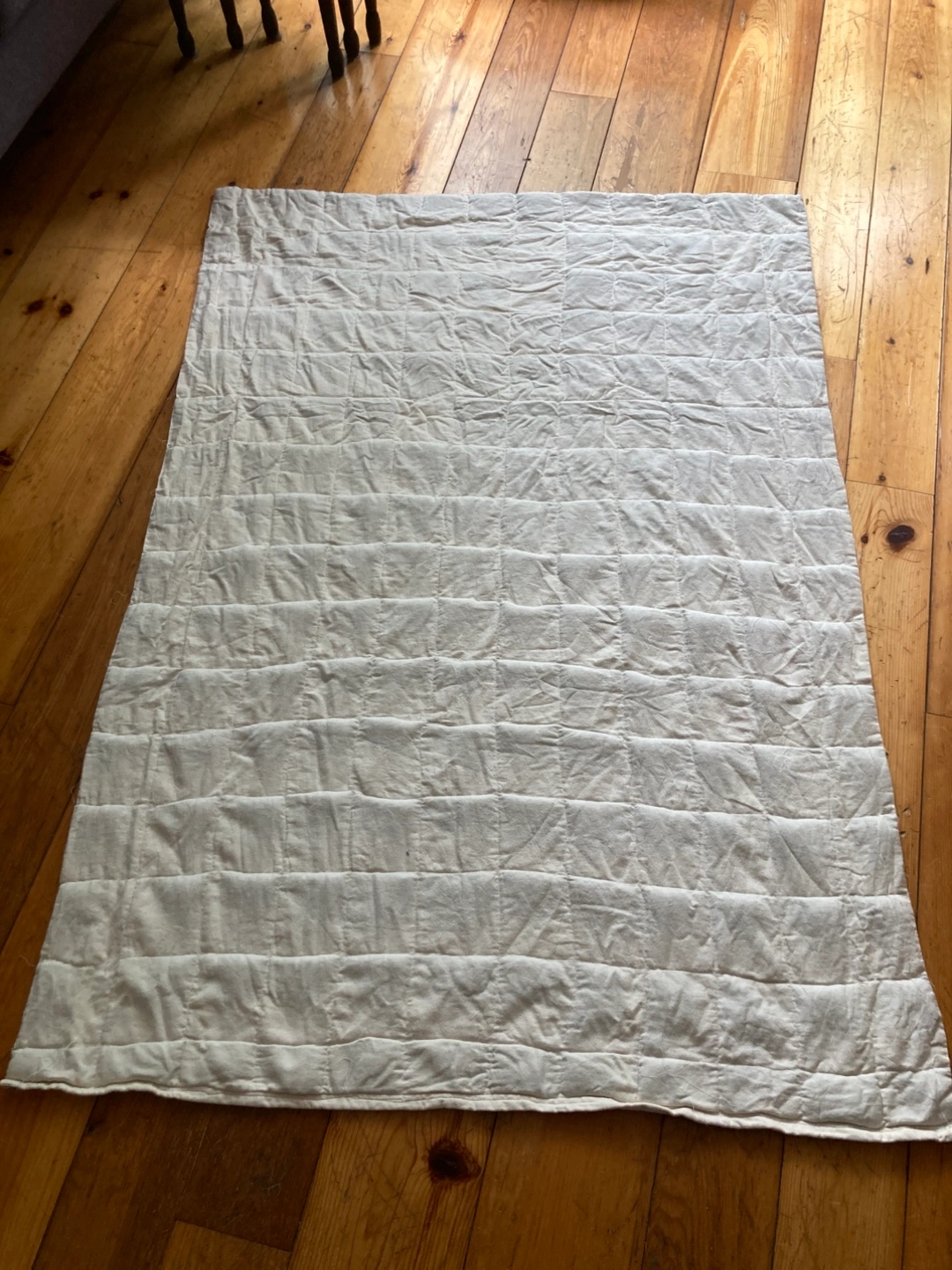 i made this weighted blanket using heavy unbleached cotton canvas. one of the covers is smooth cotton, pale blue. the other cover is polar fleece, one side white and the other spring green. both covers are washable. i made it for my child, who quickly became uninterested in using it. it is hypoallergenic and constructed of small square baffles to keep the weighted content evenly distributed. the $$ for making it was in the neighborhood of $100+ but i am happy for it to go to a good home. open to fair offers!!