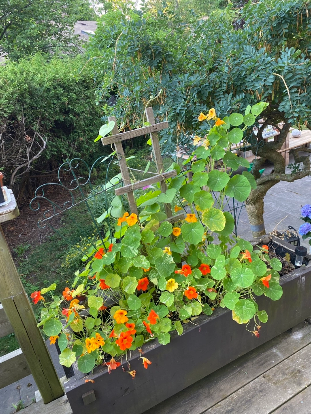 Nasturtium plants , you can eat leaves and flowers and seeds.A-beautiful plant to add to your outdoor space. If you need how to pickle Nasturtium seeds, please ask me.