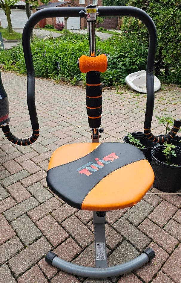 I am selling an exercise machine. It features an orange and black padded seat, along with arm supports. Using this machine can be a soothing part of your morning routine.