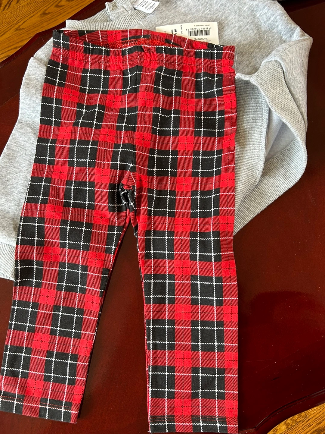 Includes a grey sweatshirt and red plaid leggings. Such a cute outfit to wear for a comfortable day at home!
