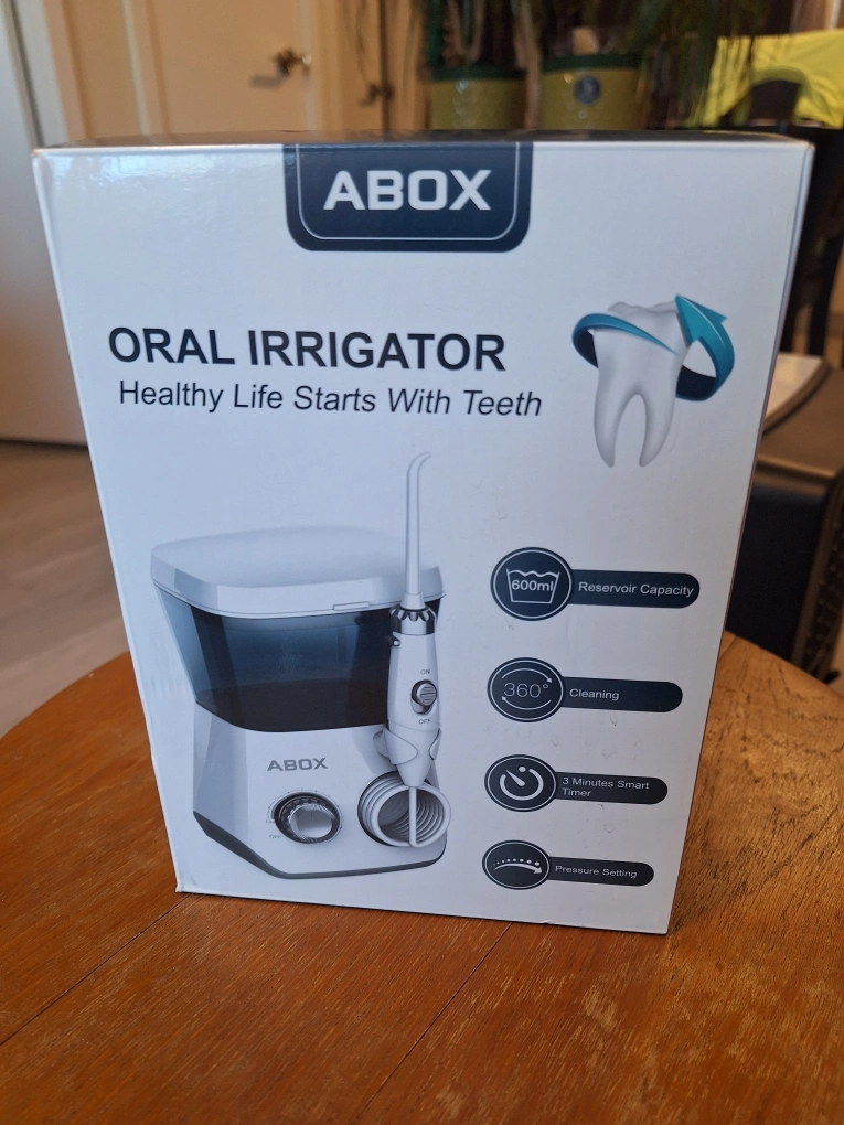 Offering a new, never used white ABOX water flosse, brand new in original packaging. It has an on/off button, pressure settings and a power cord. Included is a bag of flosser accessories. This water flosser would be a great addition to your daily dental hygiene routine.