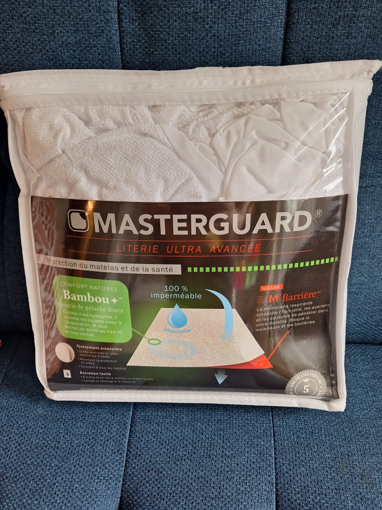 Mattress protector in original packaging. Features include expand fit XL, easy care, and 100% waterproof. Putting a new protector on your bed is a soothing experience.