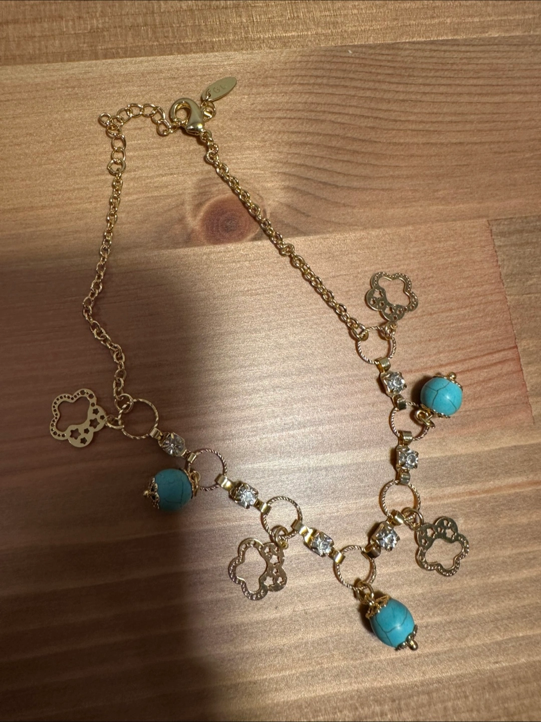 A beautiful bracelet with a delicate gold chain. Featuring turquoise beads and decorative golden charms. A lovely piece to help you find your inner peace.