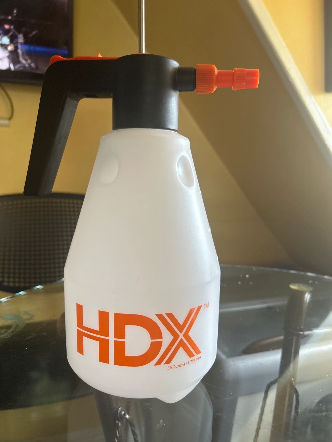 White and orange pump sprayer. Features an adjustable nozzle. Makes a great item to use when spritzing house plants.