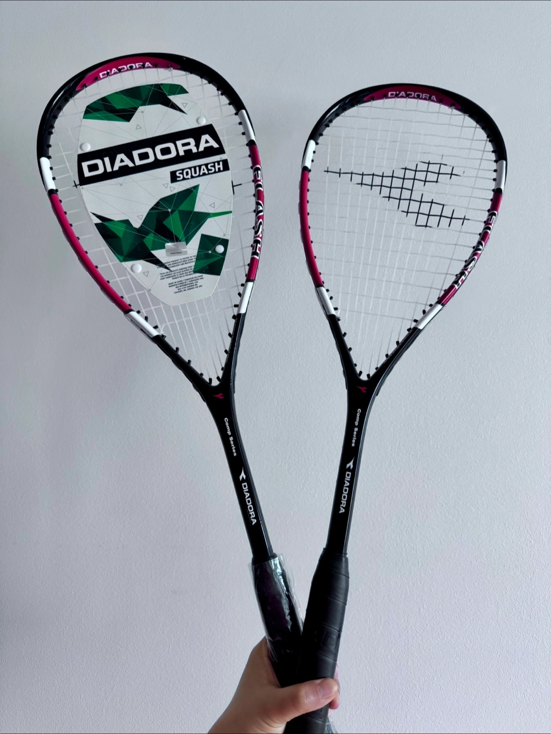 A Diadora squash racquet in black and red colours (flash model). One unused and the other used once.