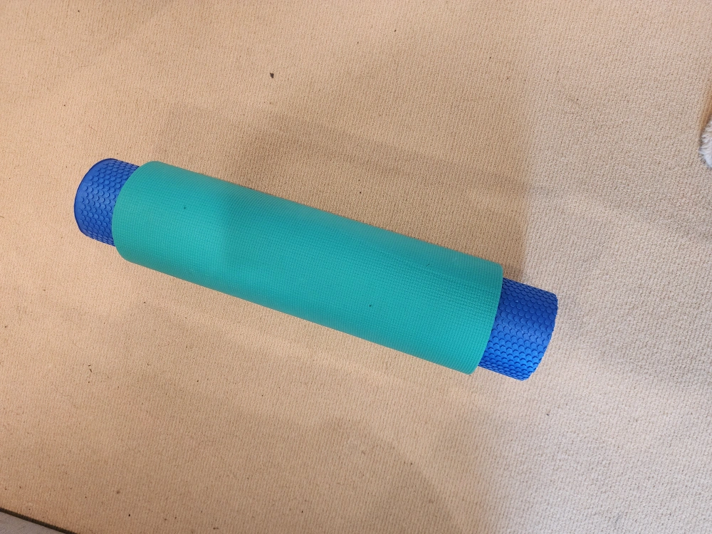 I'm selling a yoga mat and a foam roller. The yoga mat is a light green color. The foam roller is blue, it has a textured surface. You can use these to help you achieve a calming sense of well-being.