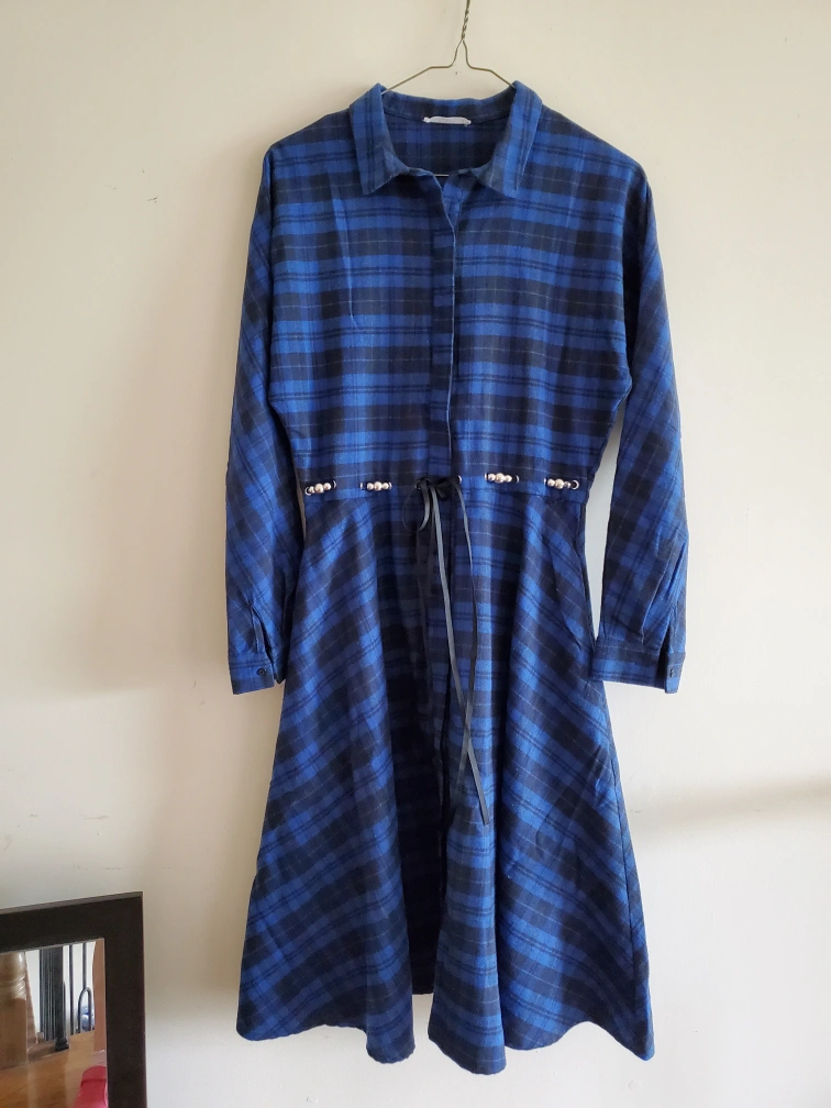 A beautiful blue plaid dress. Featuring long sleeves and a collar. Embellished with small pearls on the waist and a belt. It is perfect to wear for a walk in the park.