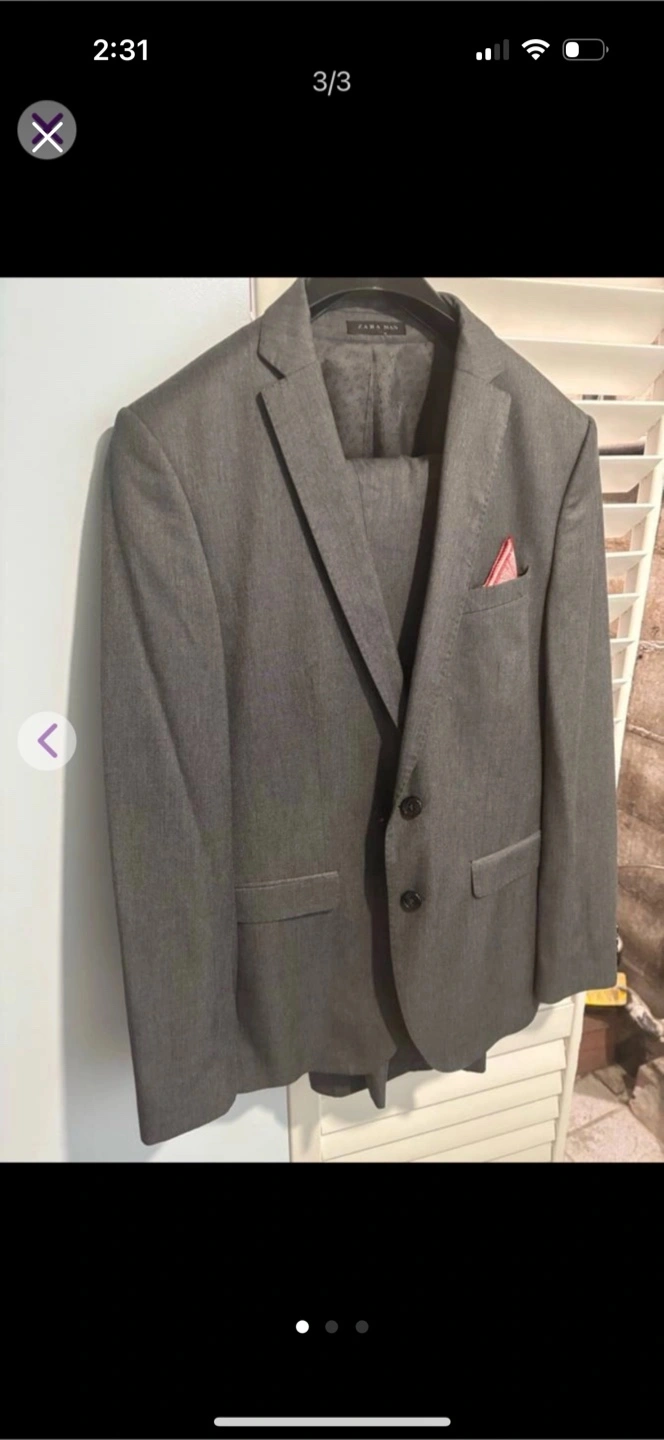 175A grey suit, including a jacket and pants. The jacket has two front pockets and two buttons. The suit has a pocket square in the jacket pocket. Suits like this can be worn for a special occasion.