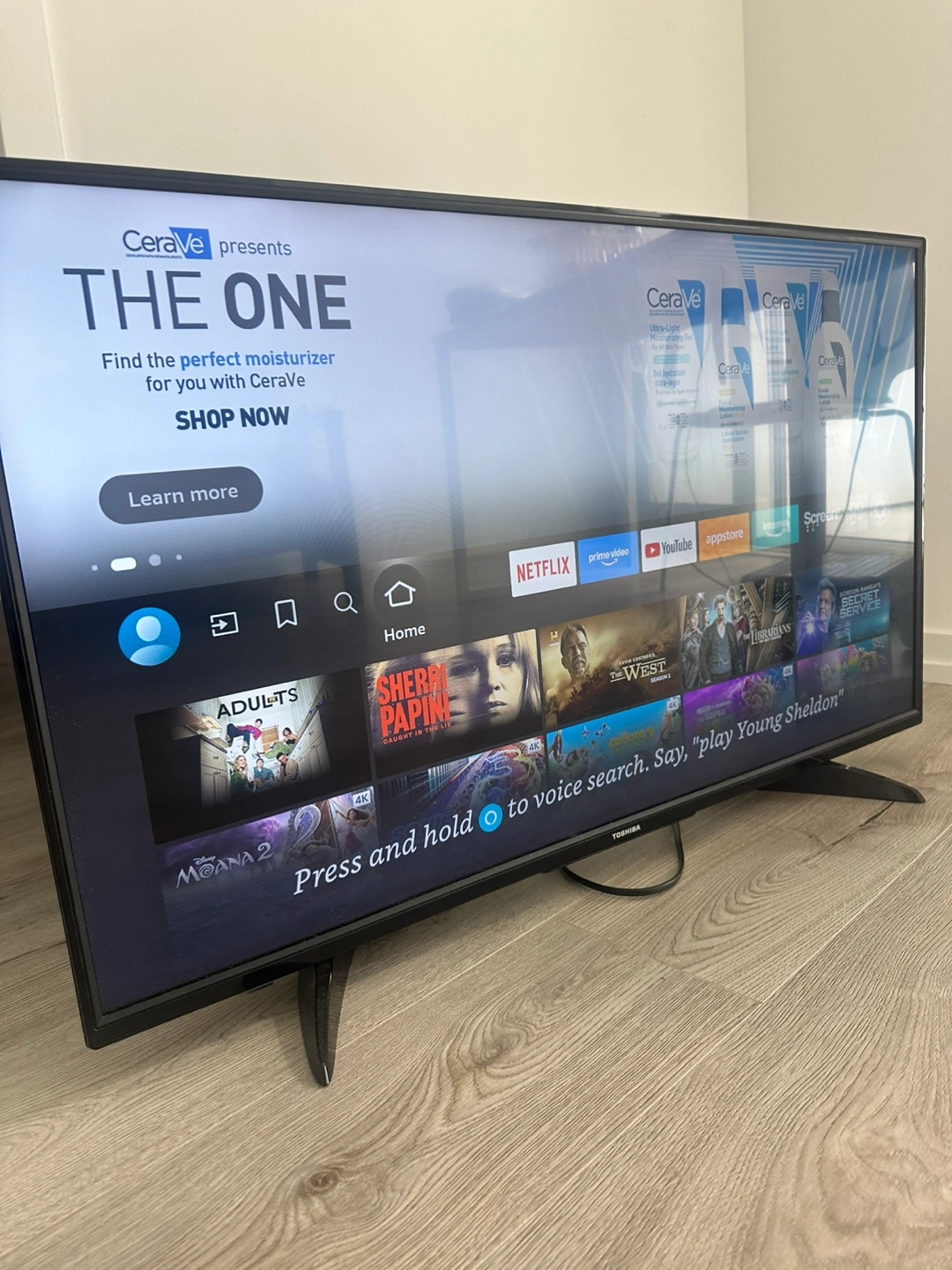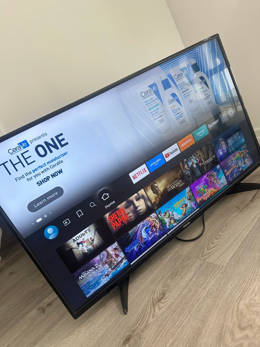 A flat-screen television with a stand. Displays the home screen with several app options. It's perfect for a relaxing movie night at home.