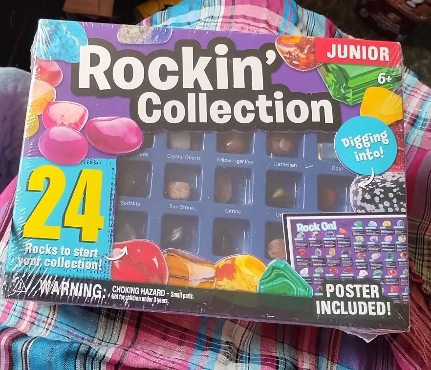 A neat rock collecting kit for any aspiring geologist, this is a great find for any rock enthusiast to start their own collection. It has a variety of rocks and a poster with information.