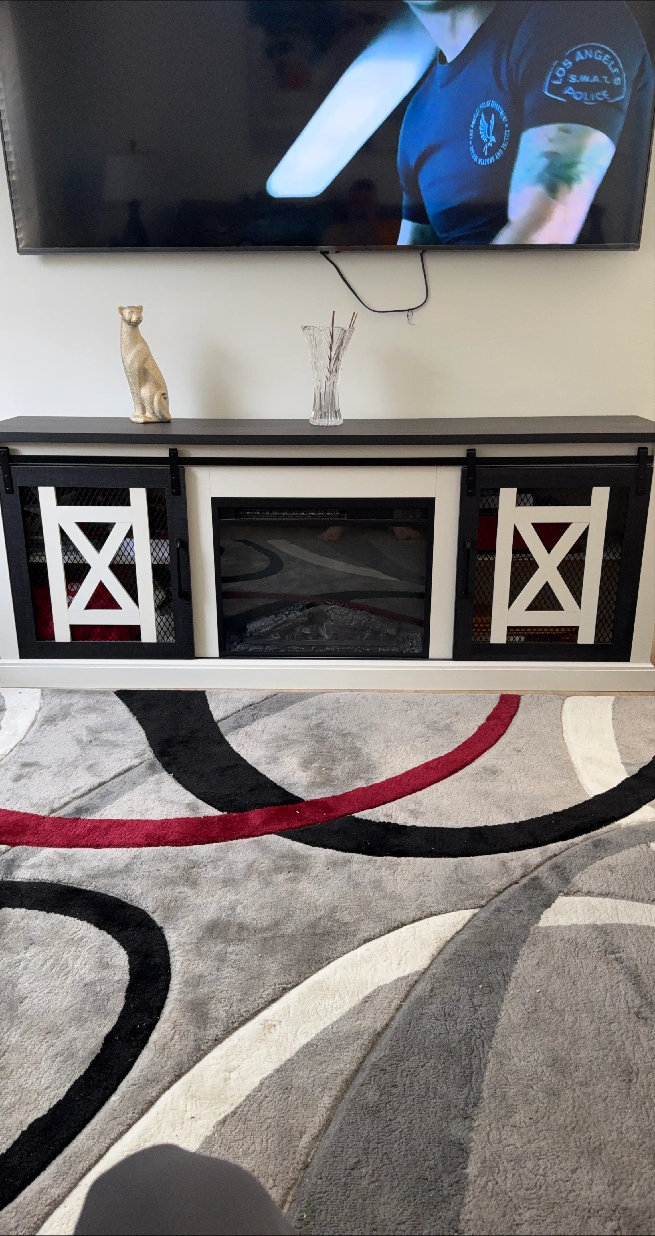 Modern entertainment center. Features sliding barn doors and a faux fireplace insert. Perfect for creating a cozy space.