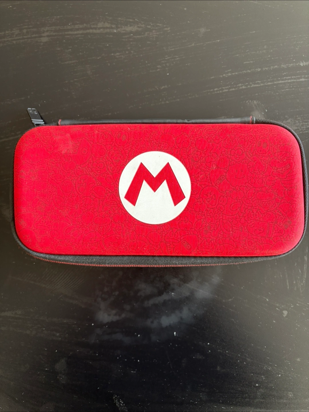 A red carrying case with a black zipper. The outside has a Mario logo in the centre. Inside there is a mesh pouch and straps for holding game cartridges. A great item to keep your games organized and protected, no matter where you go.