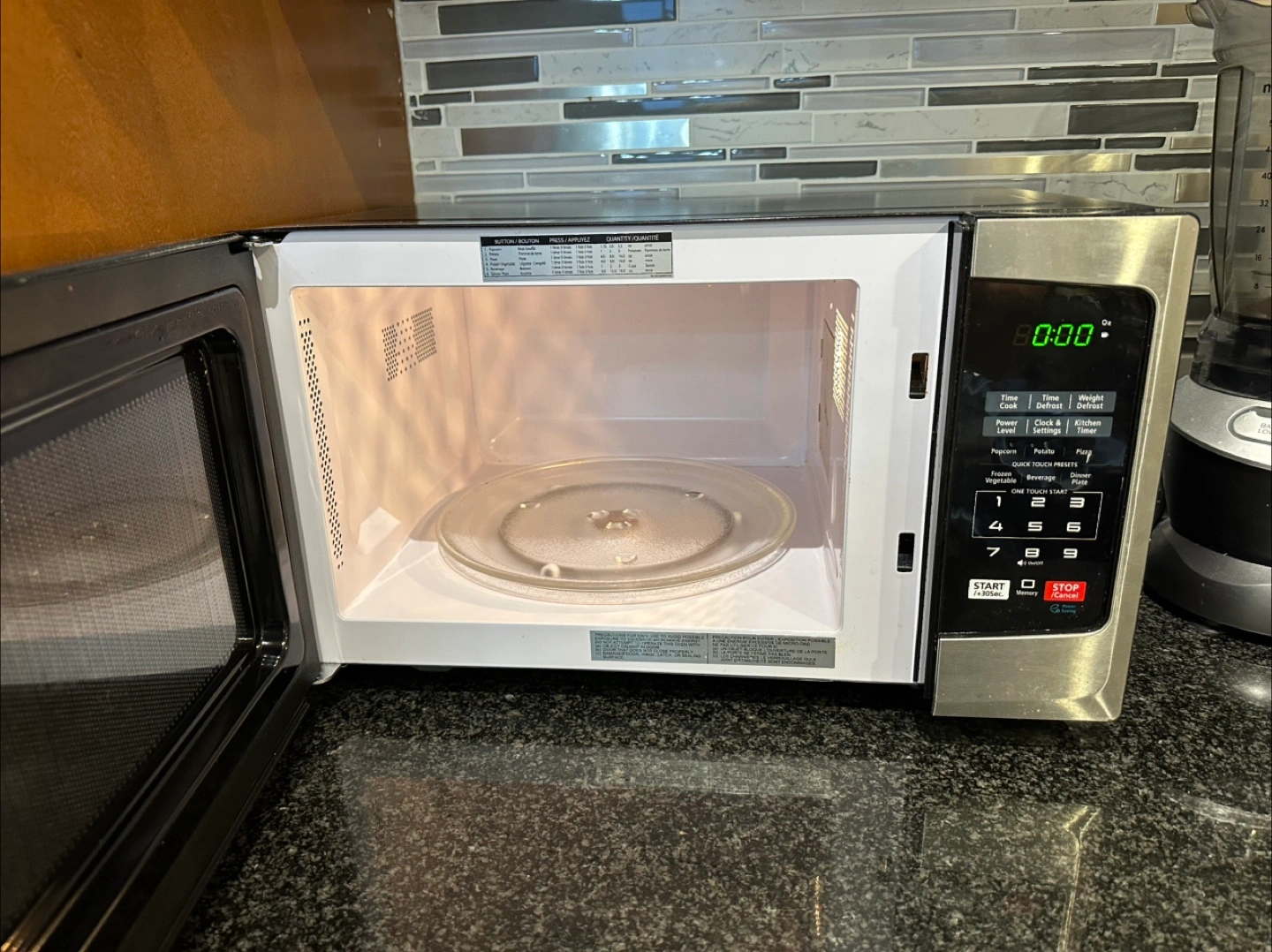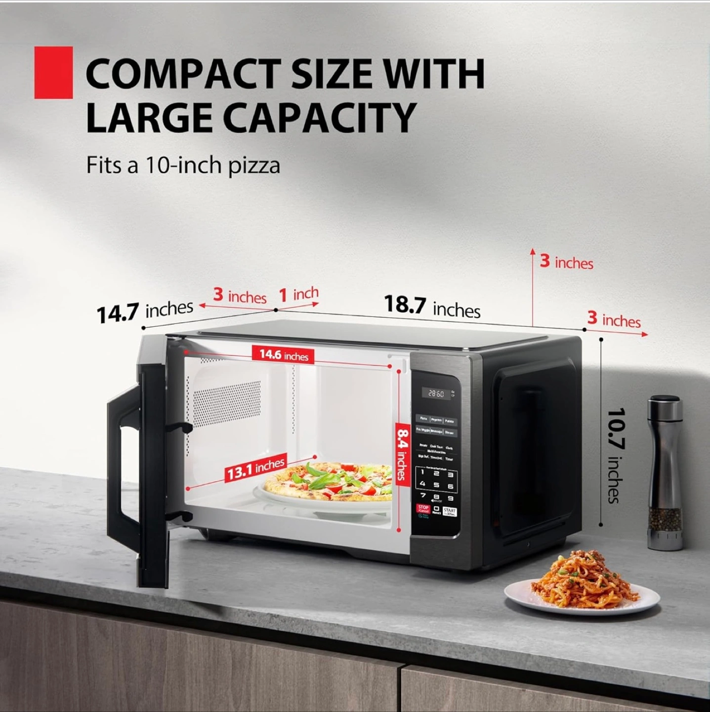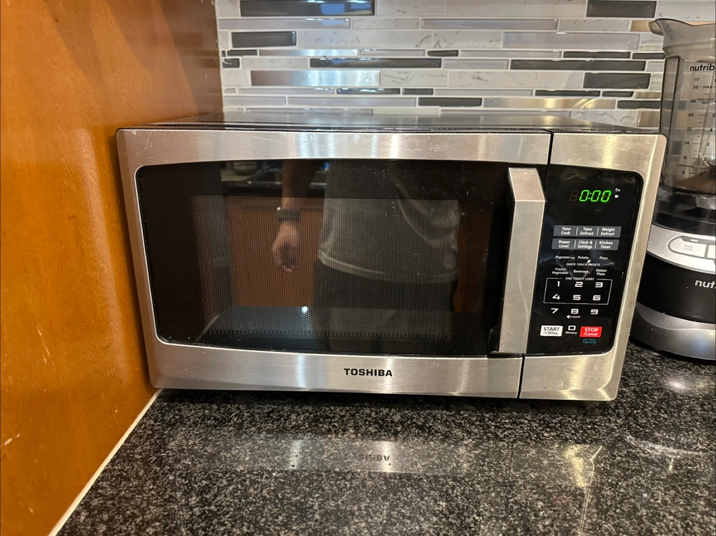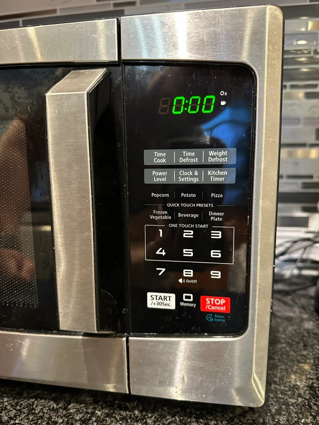 Microwave oven in a silver finish. It has a digital display, a variety of presets, and a start/stop button. You could enjoy your favourite snacks after a long day using this microwave.