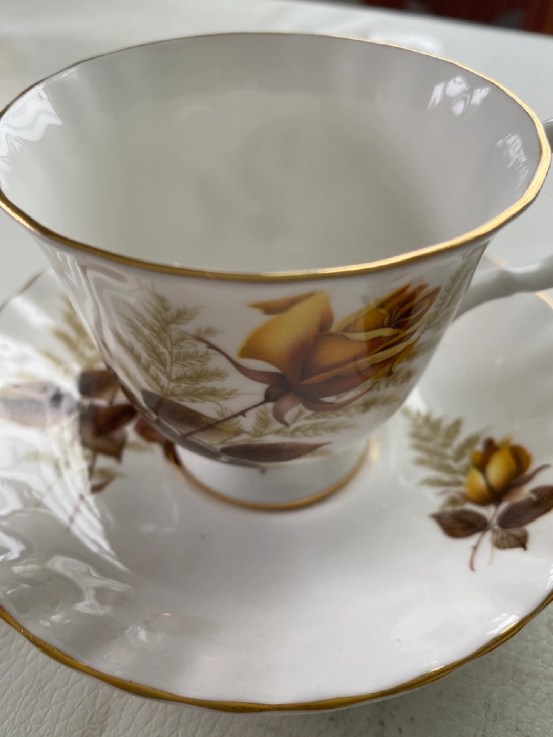 Beautiful teacup and saucer set. Features a floral design. Both pieces are trimmed in gold. A great way to enjoy a relaxing cup of tea.