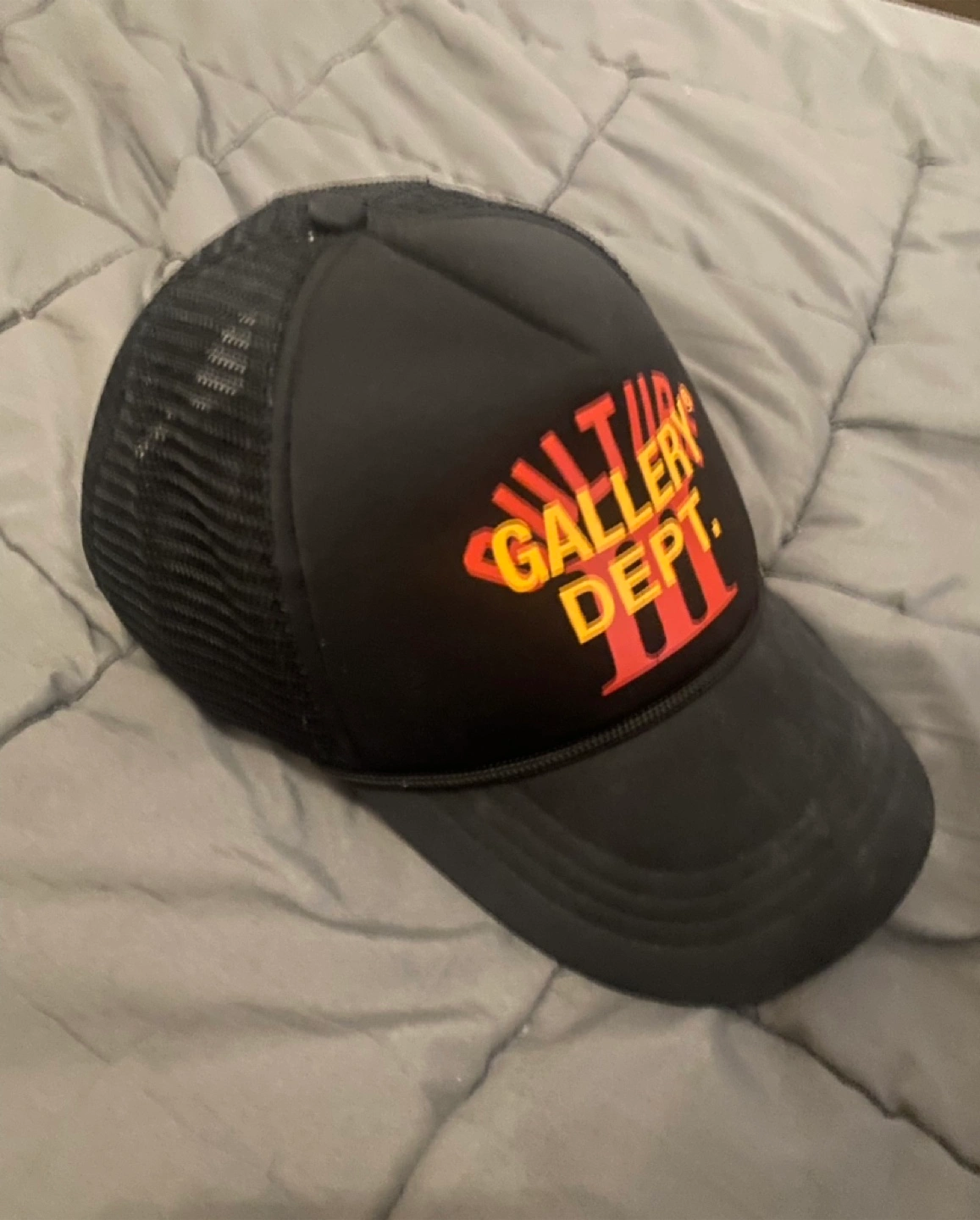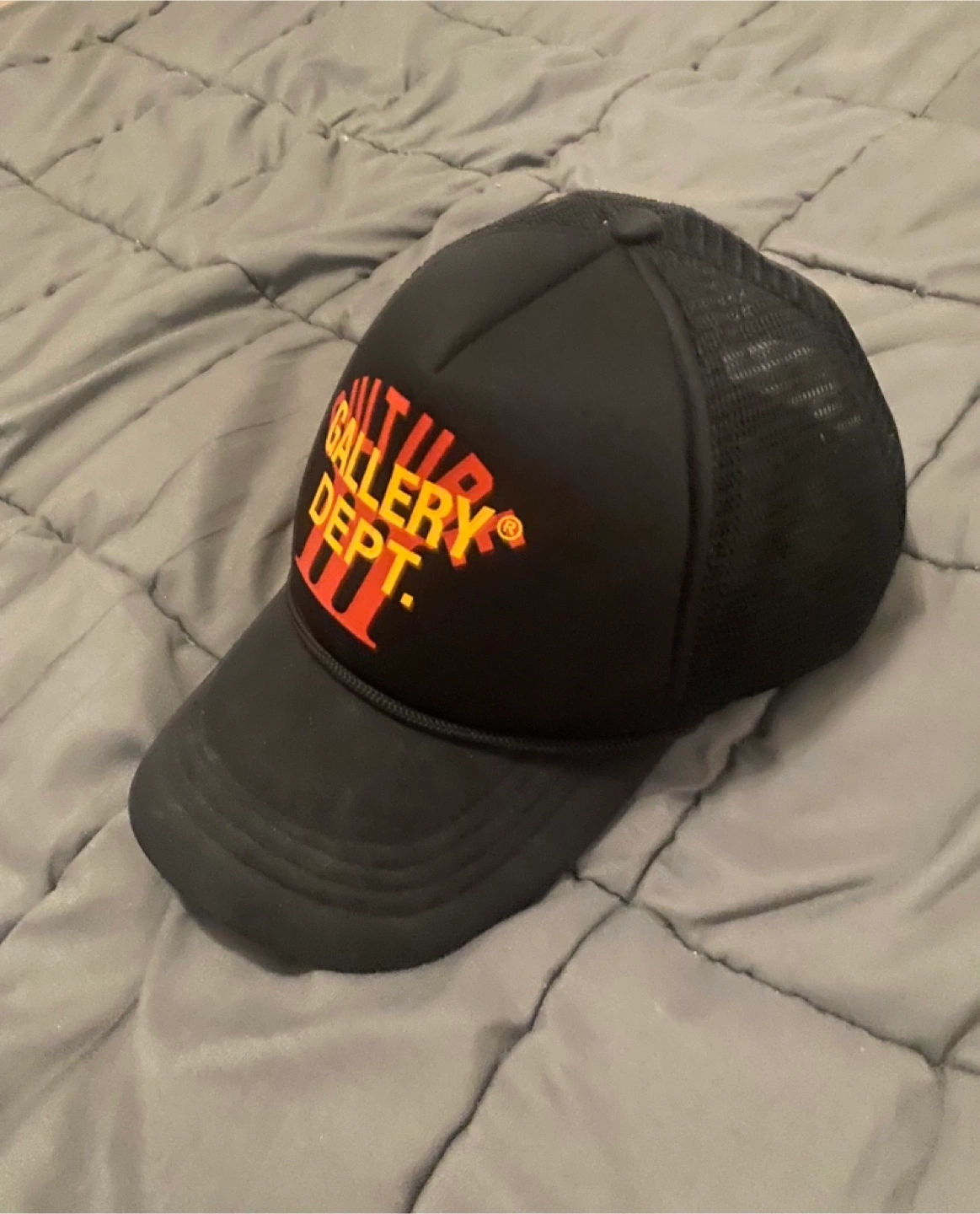 A black hat with a mesh backing. Features a Gallery Dept. logo on the front.