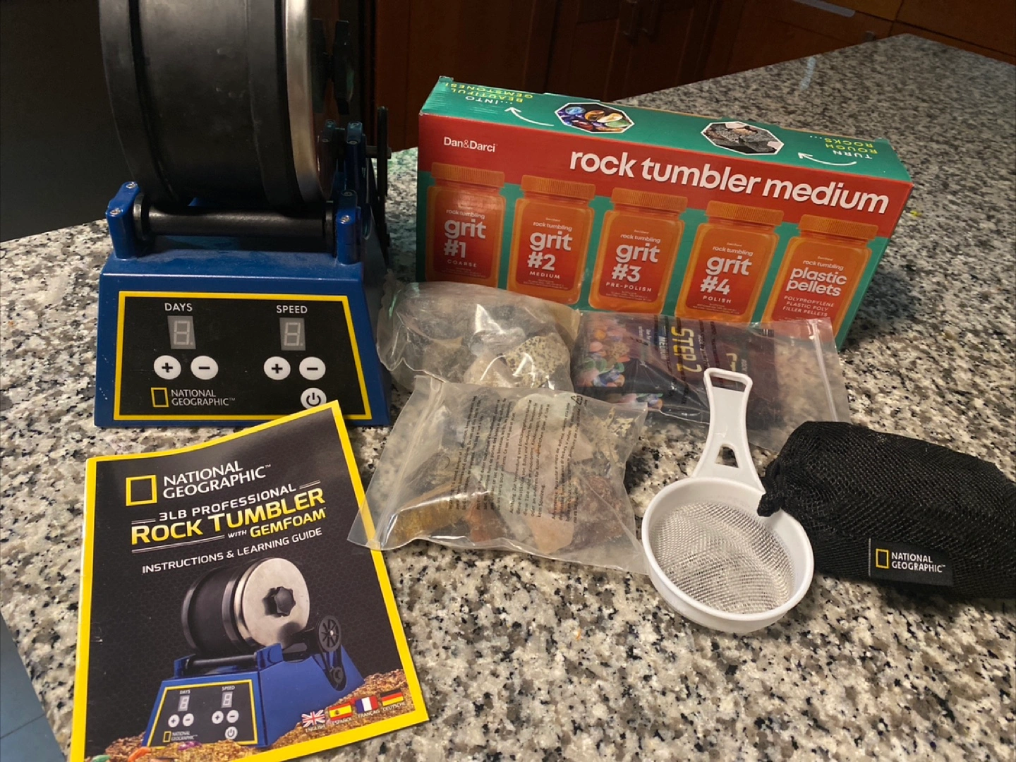 Included are bags of rocks and various grits for rock tumbling. The set also includes the tumbler, the grit, plastic pellets, and a strainer. This is a great hobby to pick up to relax and enjoy the natural beauty of rocks.