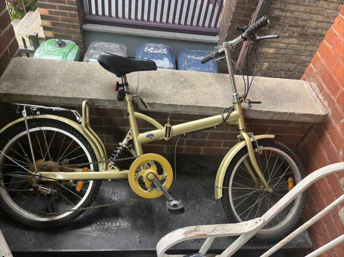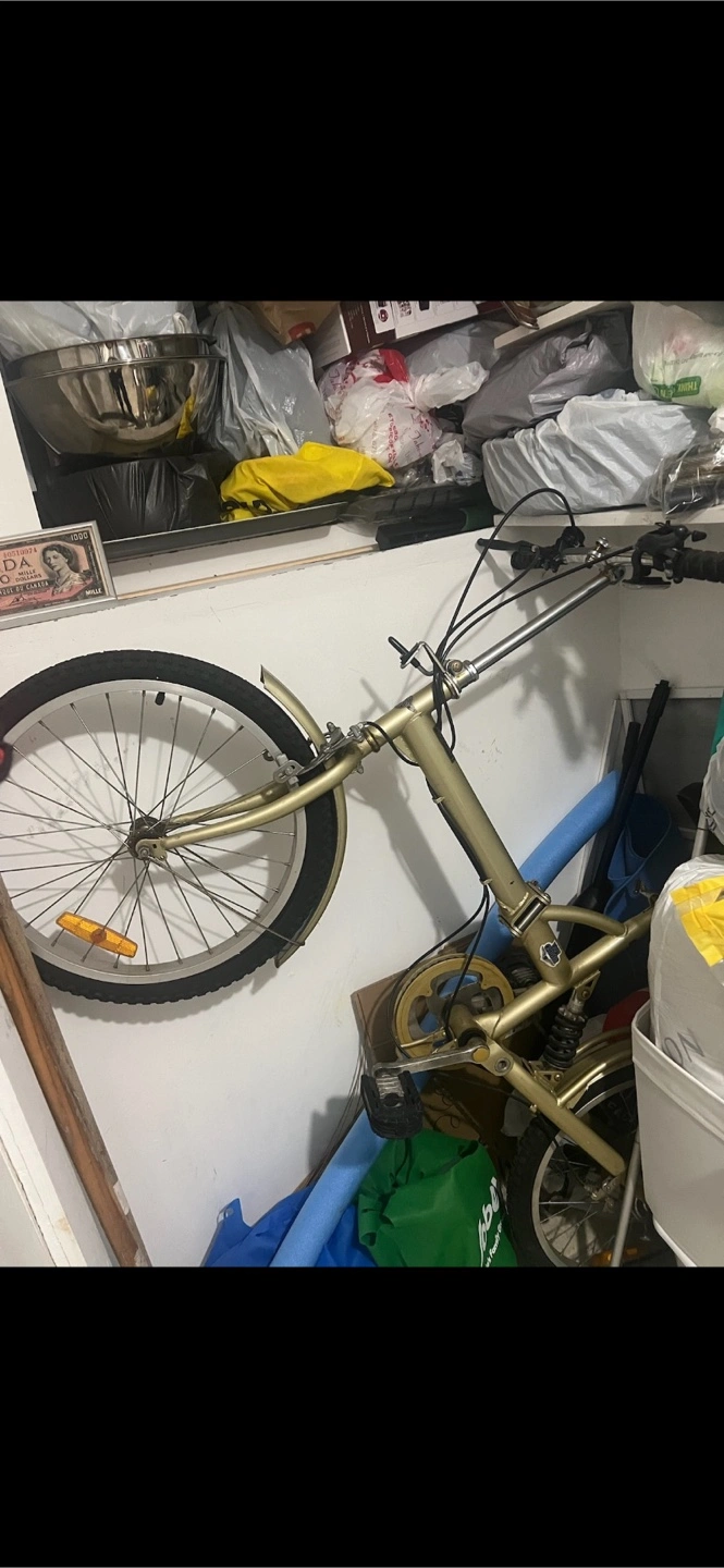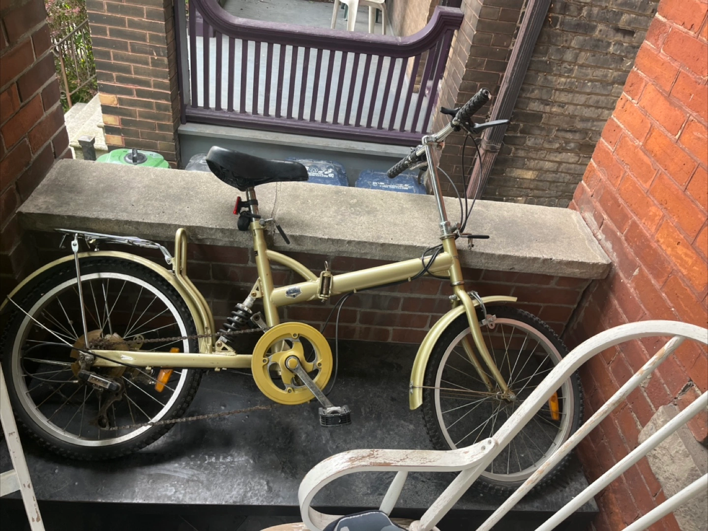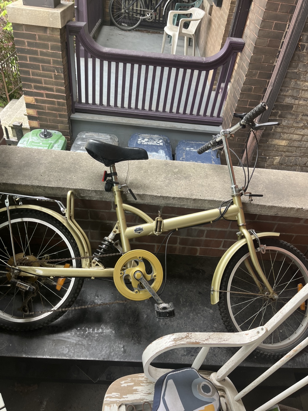 Here's a folding bike with a gold frame. Handlebars present. Features a rear rack. The bike has a black seat. A great choice for leisurely rides through the city. Adjustable bike seat. Also good for uber eats and door dash.
